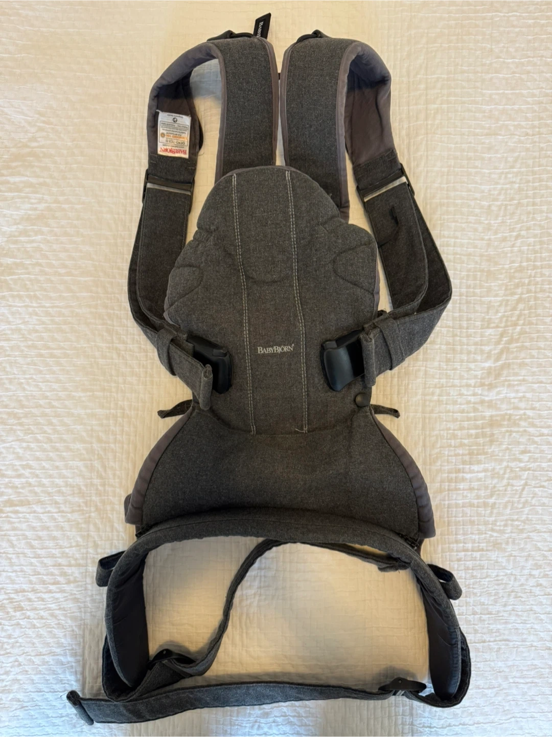 Selling our beloved BabyBjörn Baby Carrier One in Denim Grey Cotton Mix. Including a black soft cover for colder days.