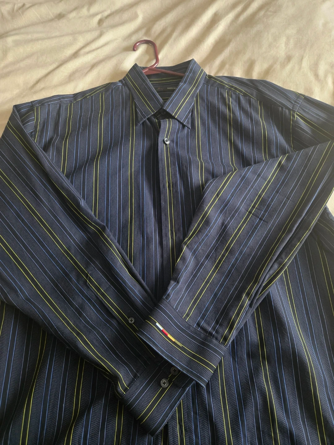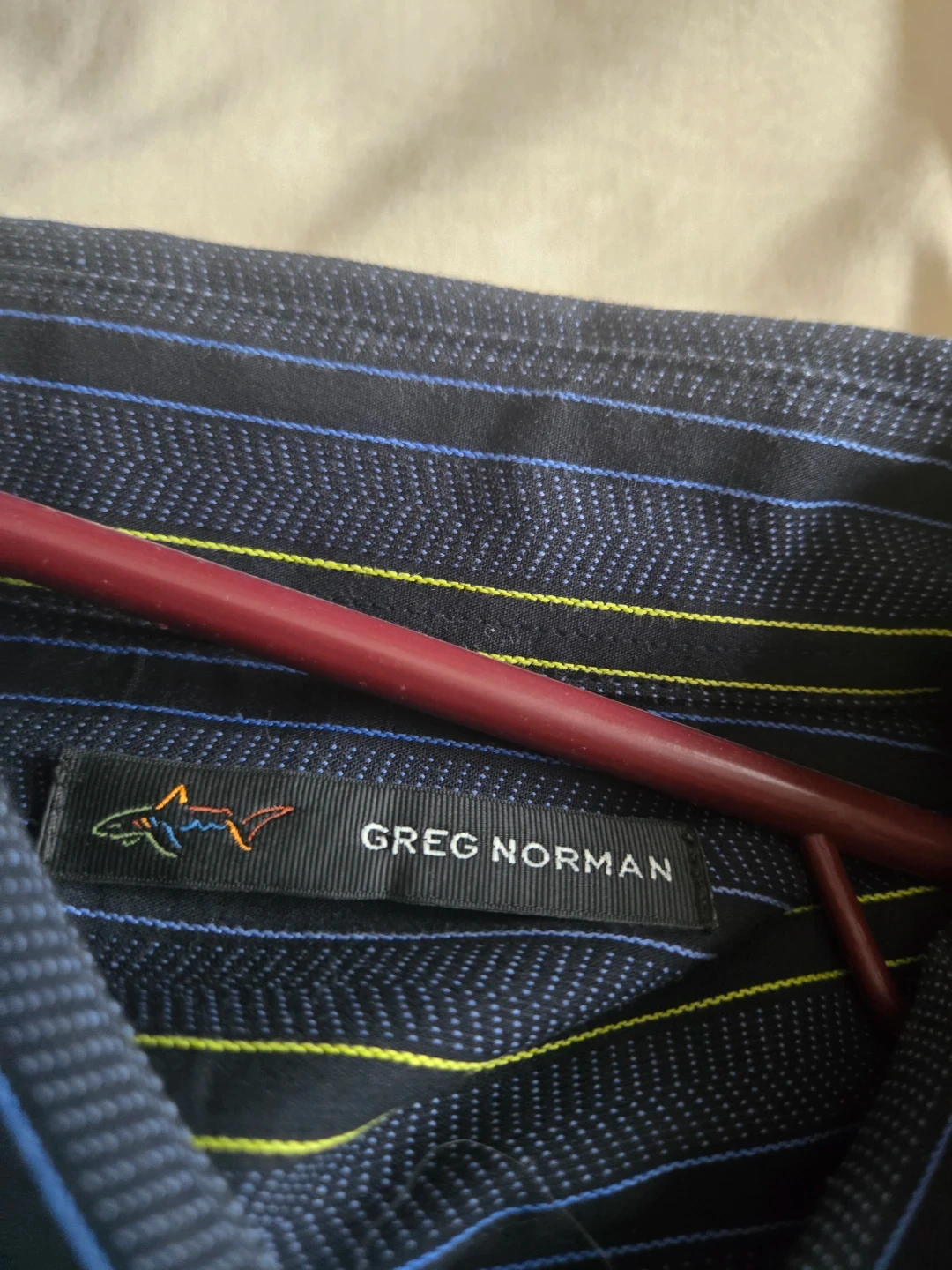 This is a Greg Norman men's collared shirt with a striped pattern. It's a size XL. The shirt is made of fabric and features a button-up front. This shirt is suitable for casual or business casual wear. Exellent condition.