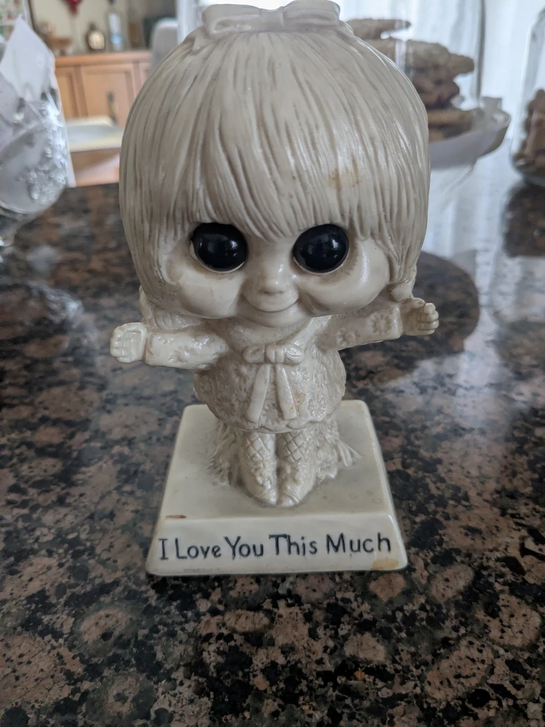 Buy & SellNodding Doll "I Love You This Much"Nodding Doll "I Love You This Much"$5This is a vintage nodding doll. It has a cream-coloured finish and large black eyes. The base reads "I Love You This Much".WHERE TO MEETCheck LocationView MapSELLERMelindaKing City100 reviews0 chats·0 favorites·1 viewsSEND CHAT TO SELLERHi Melinda! I’m interested in your listing.Hi Melinda! I’m interested in your listing.Get the Karrot app to chatSign In to chat