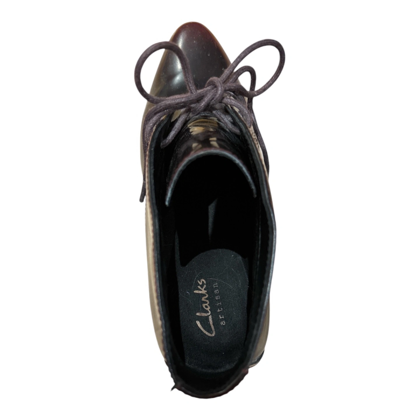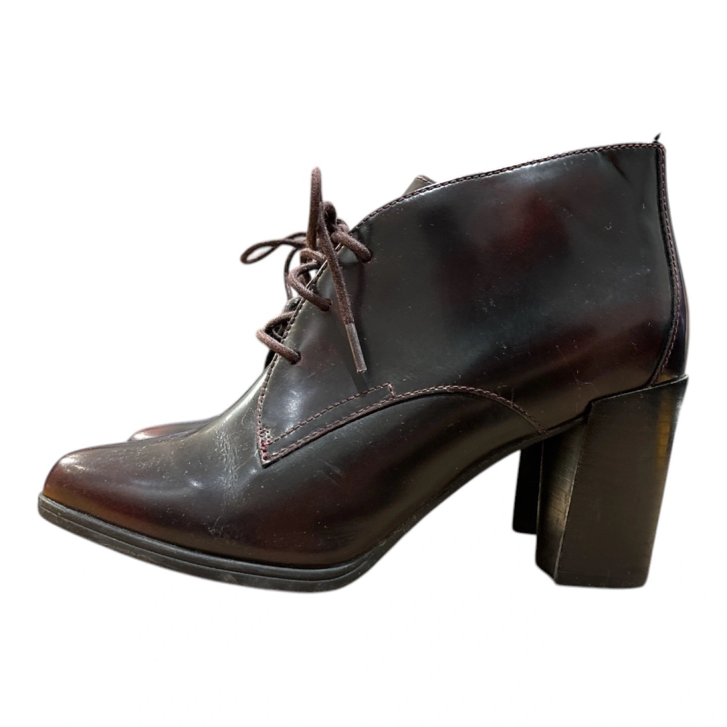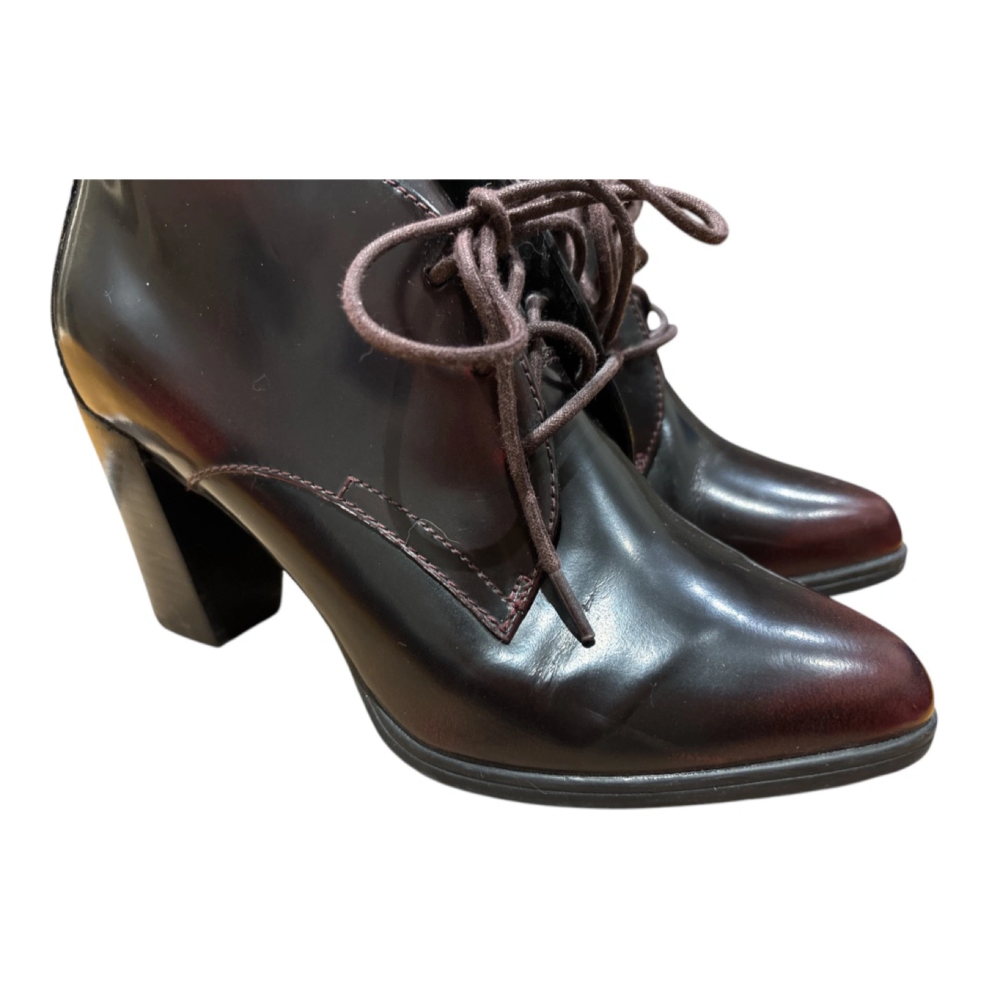 Shiny very good condition pair of women's leather ankle boots from Clarks Artisan. Dark burgundy colour. 3 inches Block heel. Lace-up front. Pointed toe. No scratches on leather. Very comfortable for walking.