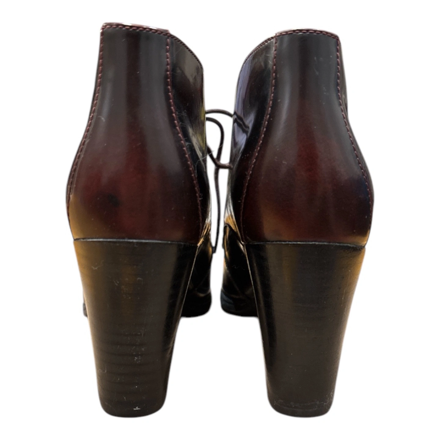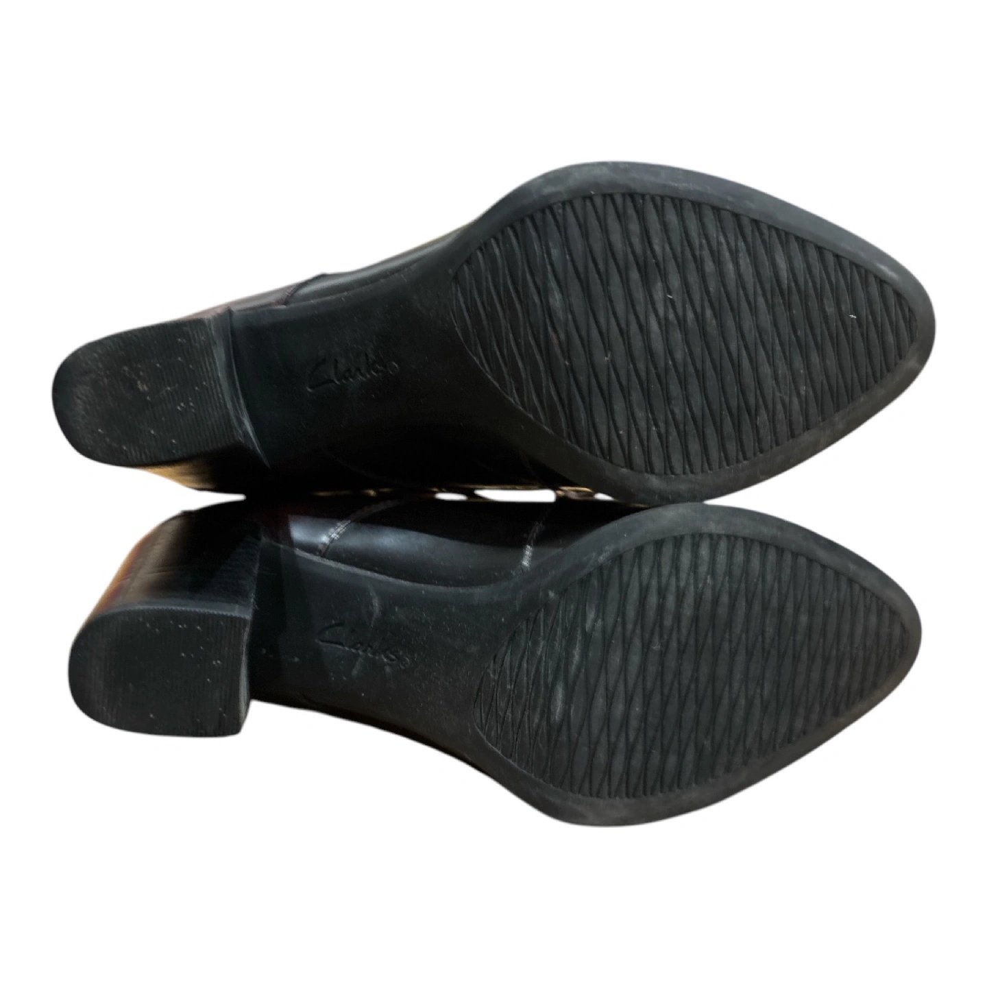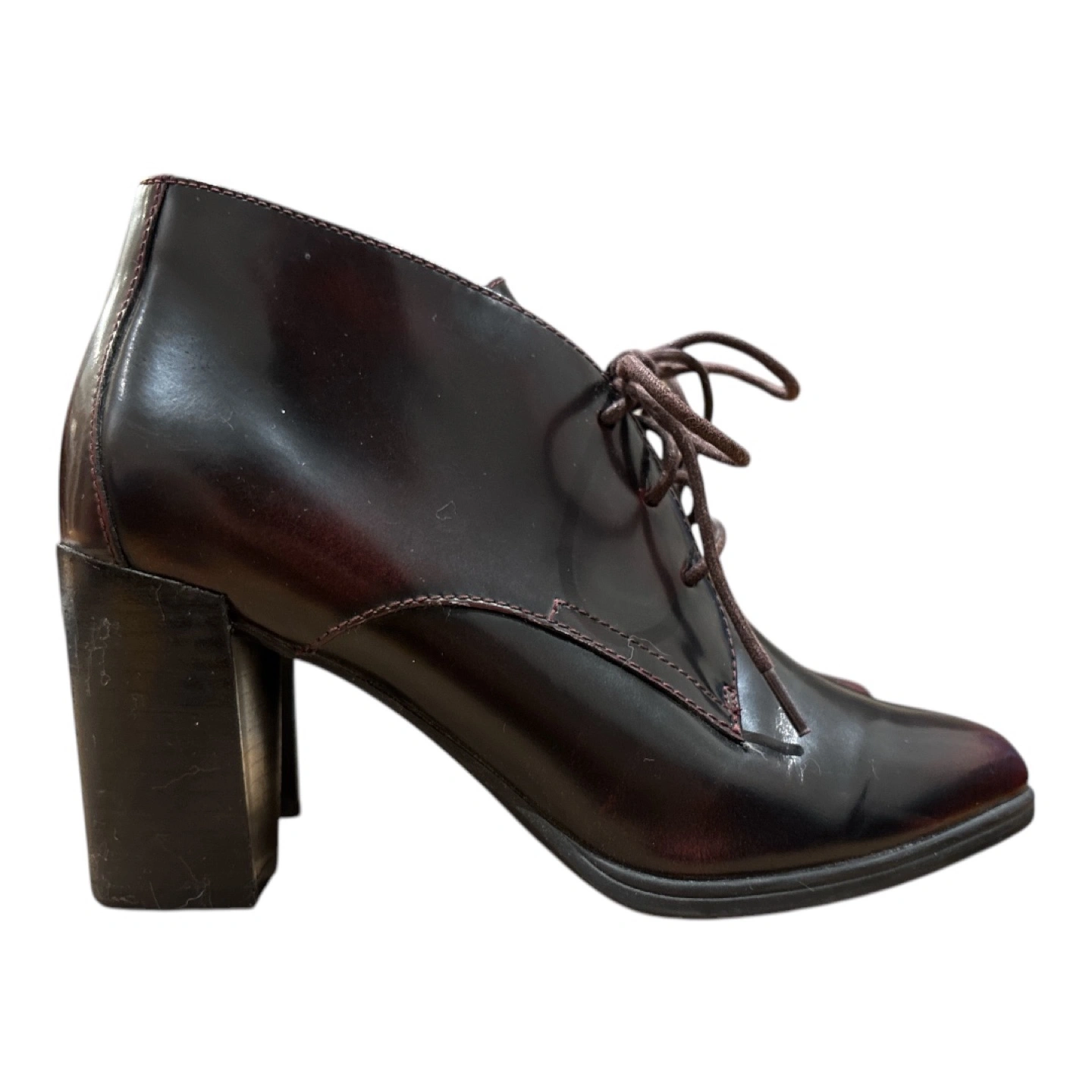 Shiny very good condition pair of women's leather ankle boots from Clarks Artisan. Dark burgundy colour. 3 inches Block heel. Lace-up front. Pointed toe. No scratches on leather. Very comfortable for walking.