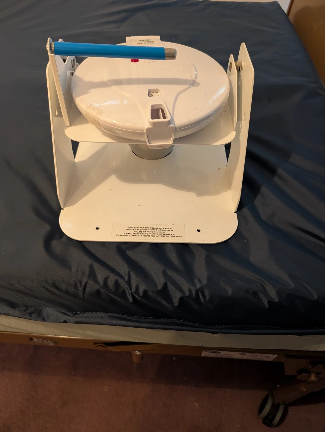 This e-pill MedTime Station helps organize your pills. It's a pill dispenser with a blue handle and a white body. The station has a rotating mechanism for dispensing. Set specific times for med dispense throughout 24hr day for 7 day week, alarms when meds ready to dispense.