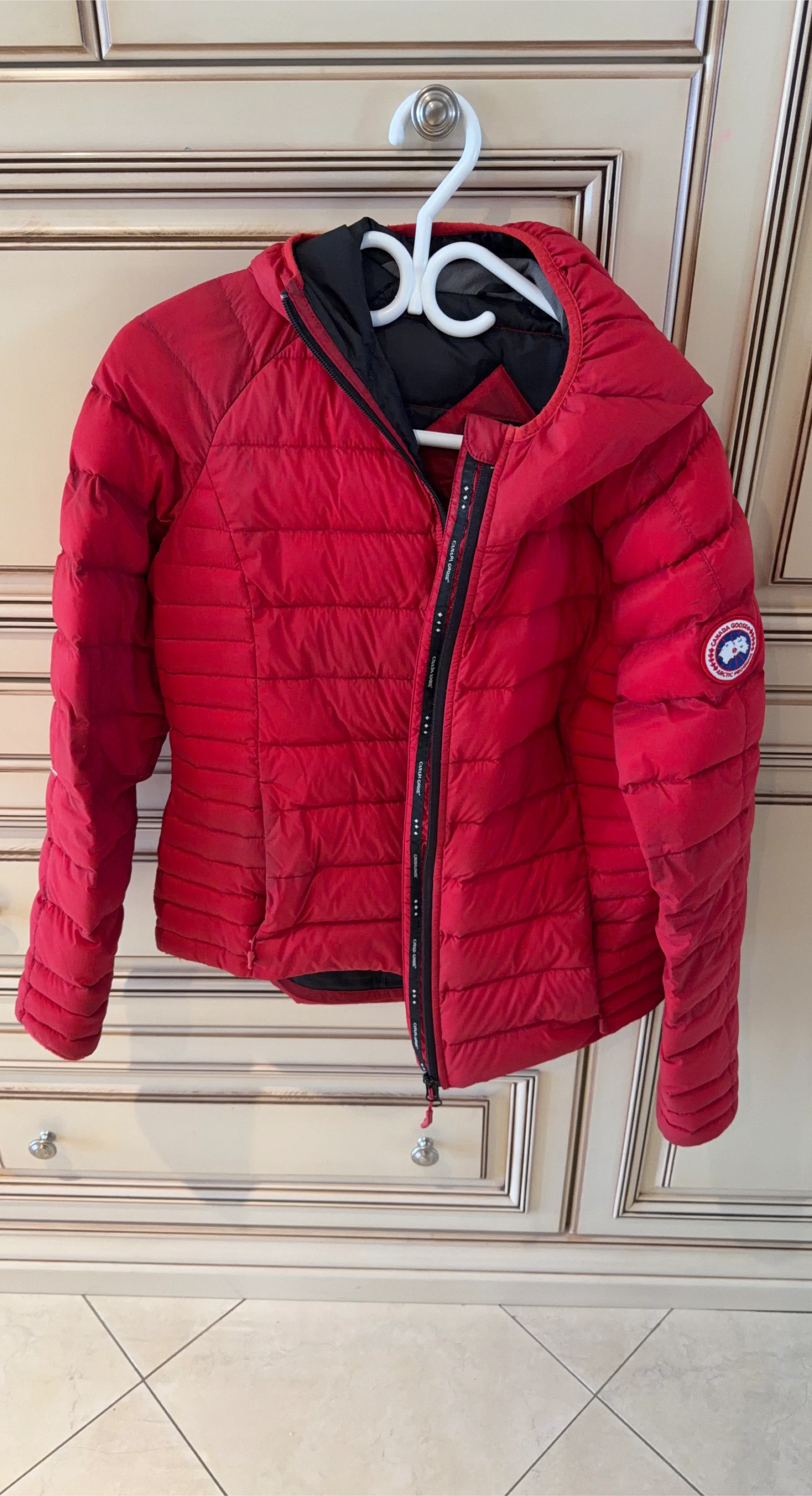 Red Canada Goose puffer jacket with a hood. Features a full-zip front and the signature Arctic Disc logo on the sleeve. It's a warm and stylish outerwear option.