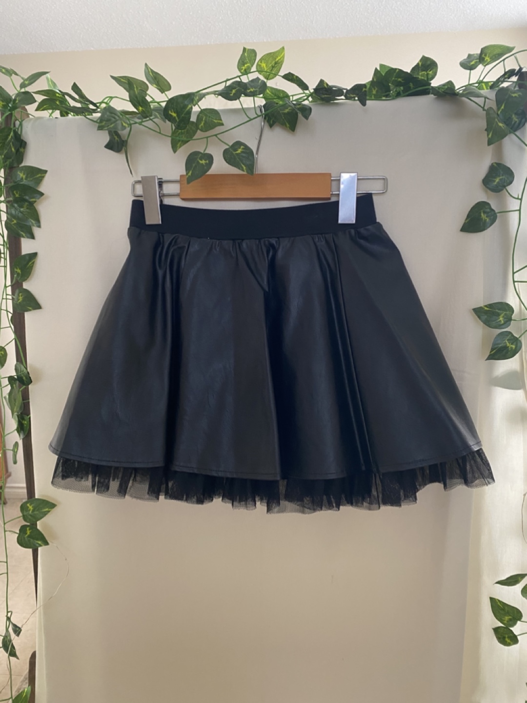 Black faux leather skirt with tulle underlay. Elastic waistband. Size 11/12. Could fit an xs pretty well! Good condition.