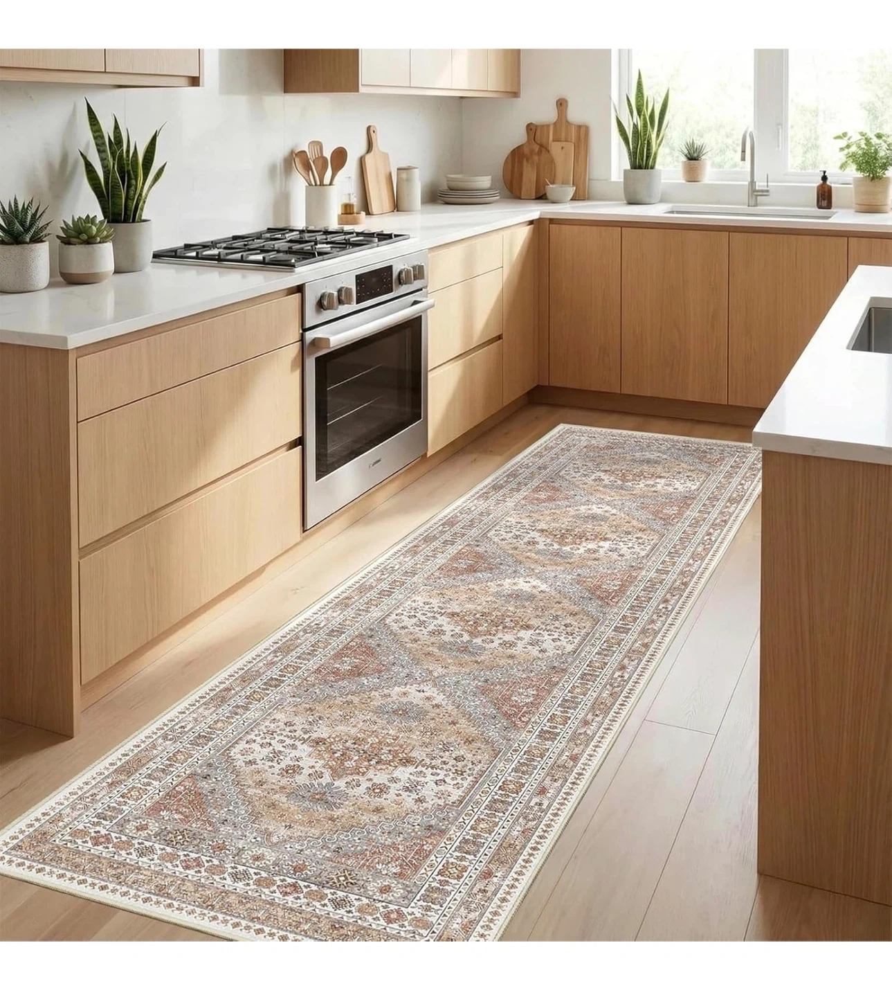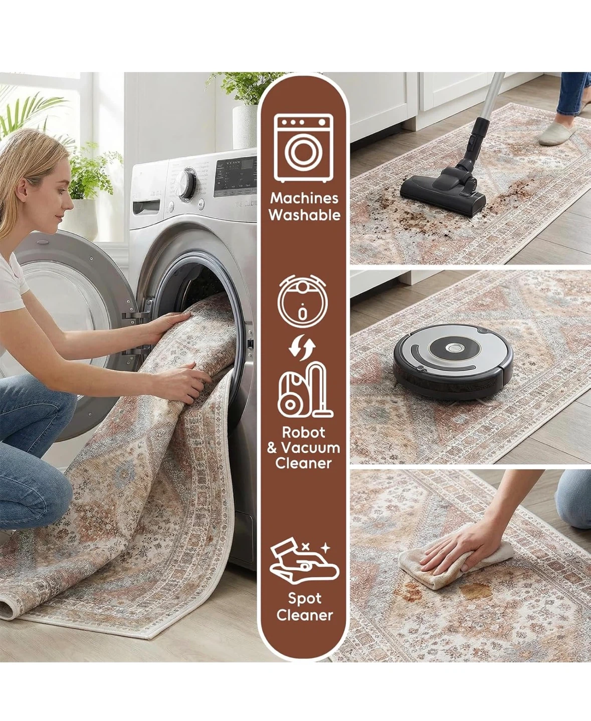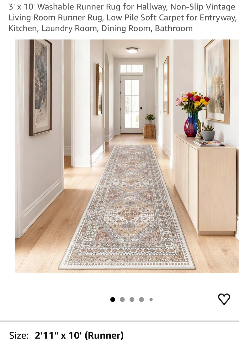 This vintage-style runner rug measures 2'11" x 10'. It's machine washable and features a non-slip backing. The low pile design makes it easy to clean with a vacuum or spot cleaner.