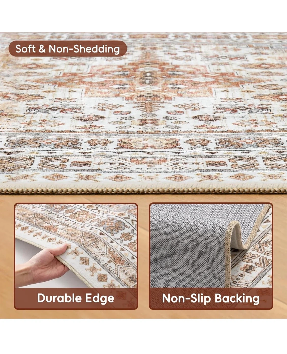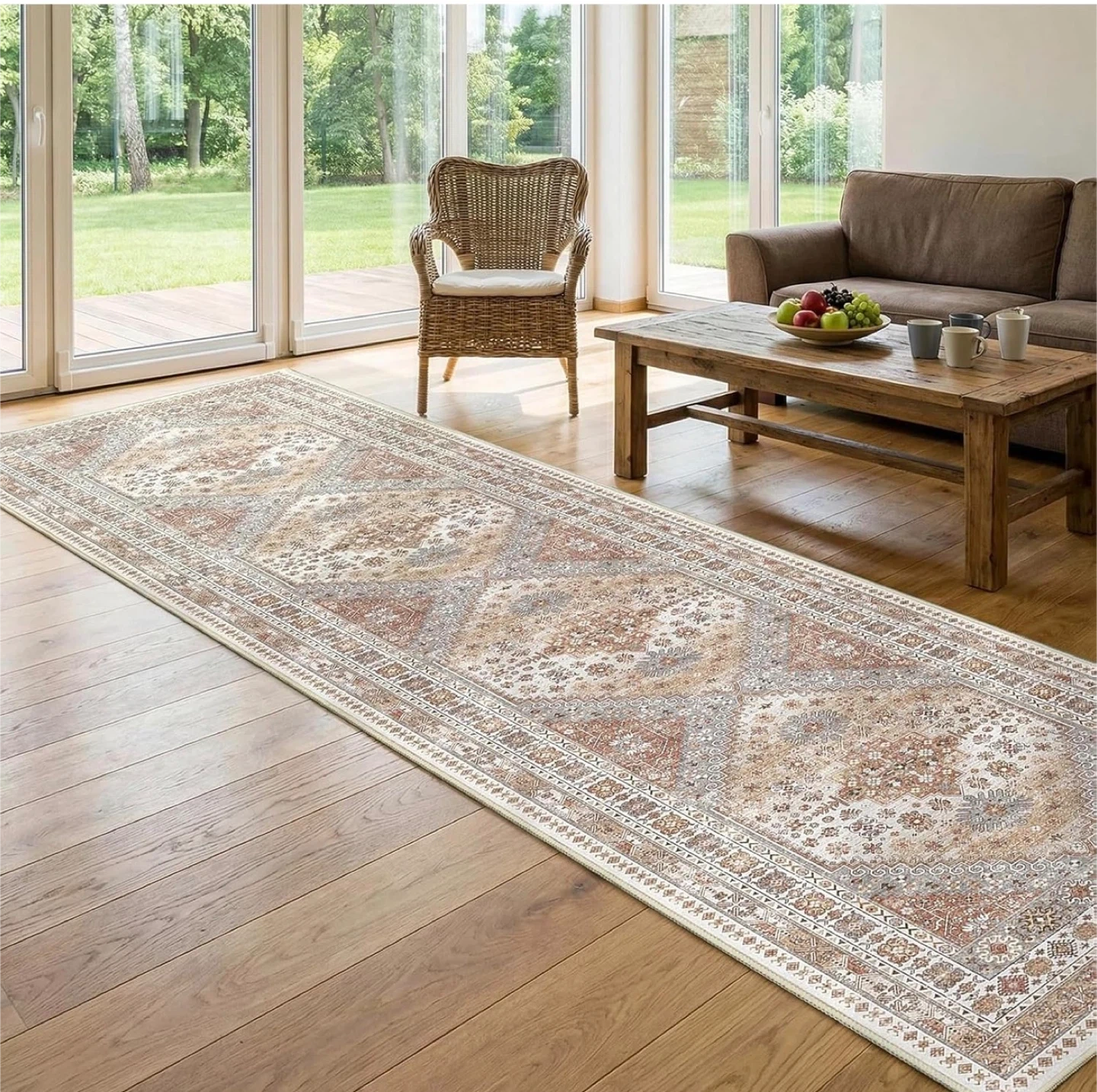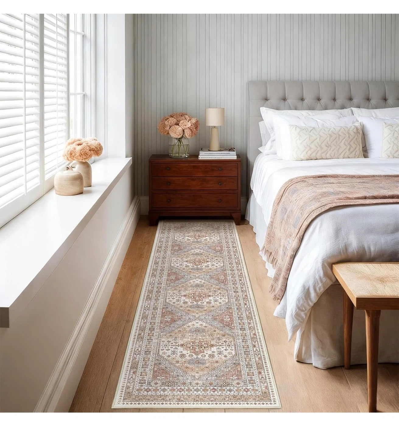 This vintage-style runner rug measures 2'11" x 10'. It's machine washable and features a non-slip backing. The low pile design makes it easy to clean with a vacuum or spot cleaner.
