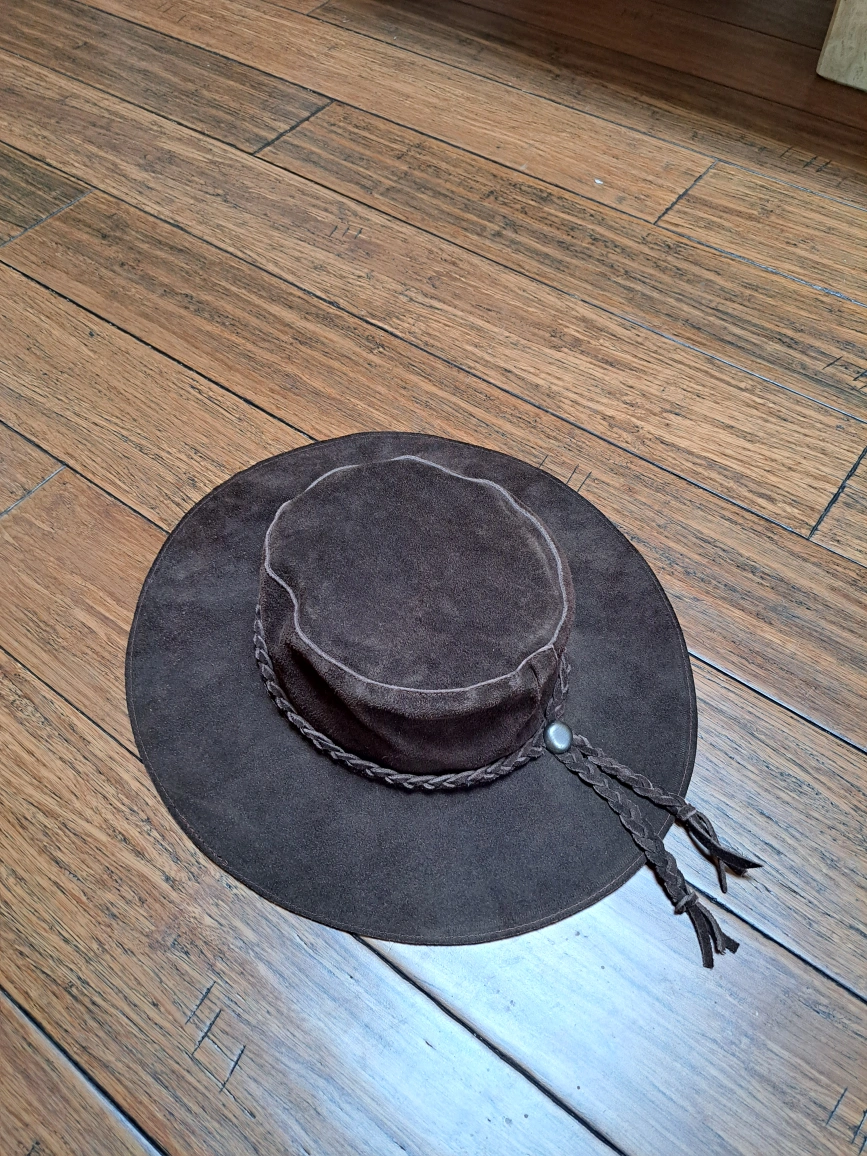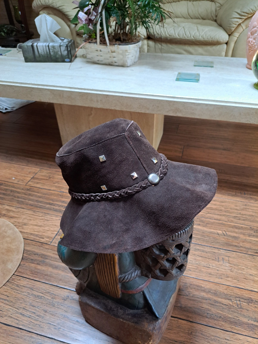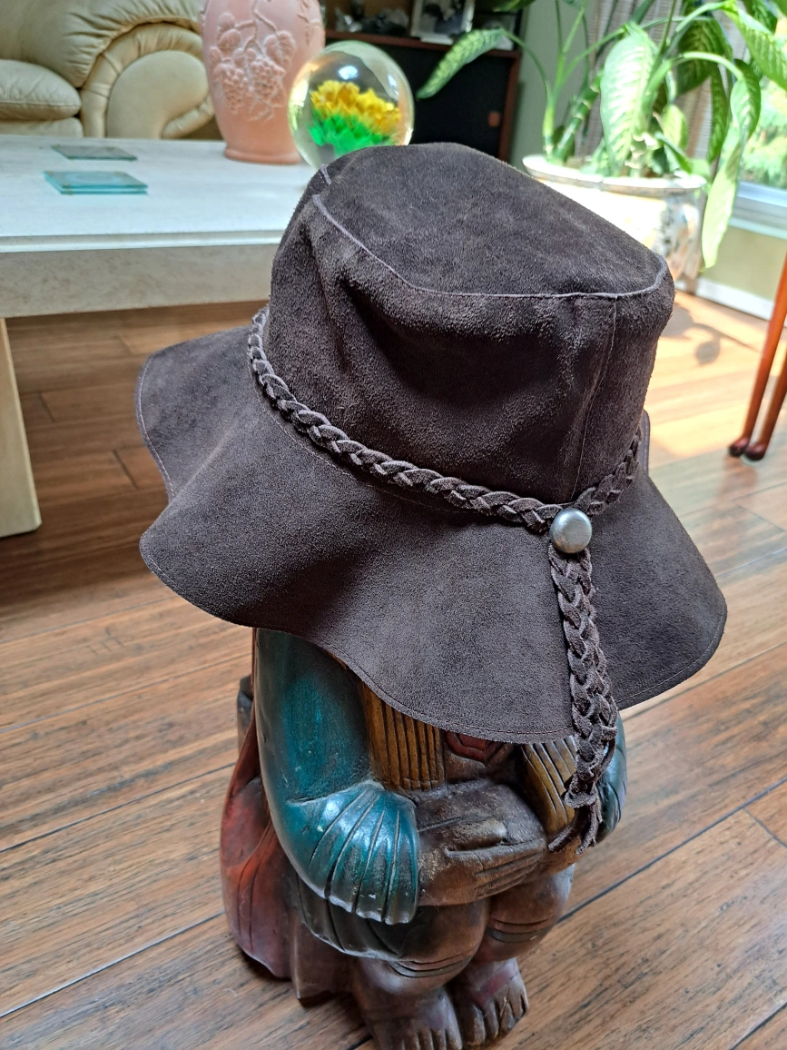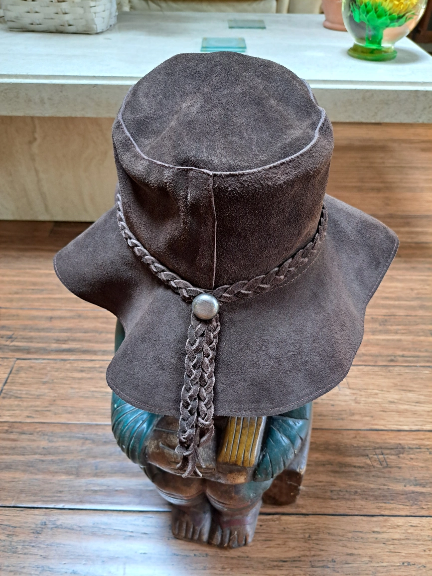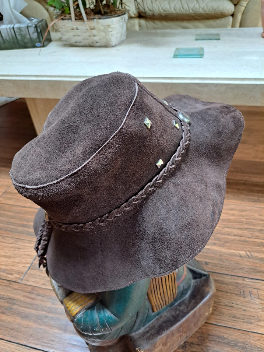 Here's a stylish brown suede hat with a braided detail around the crown! It has a wide brim and a unique silver button accent. Perfect for adding a touch of flair to any outfit! The material is soft and comfortable, great for all-day wear