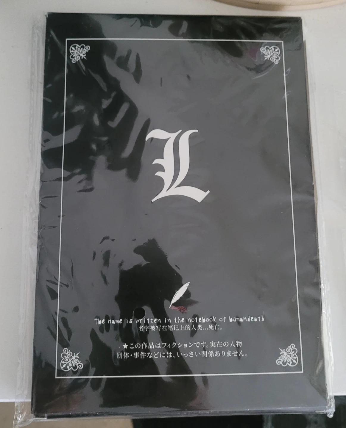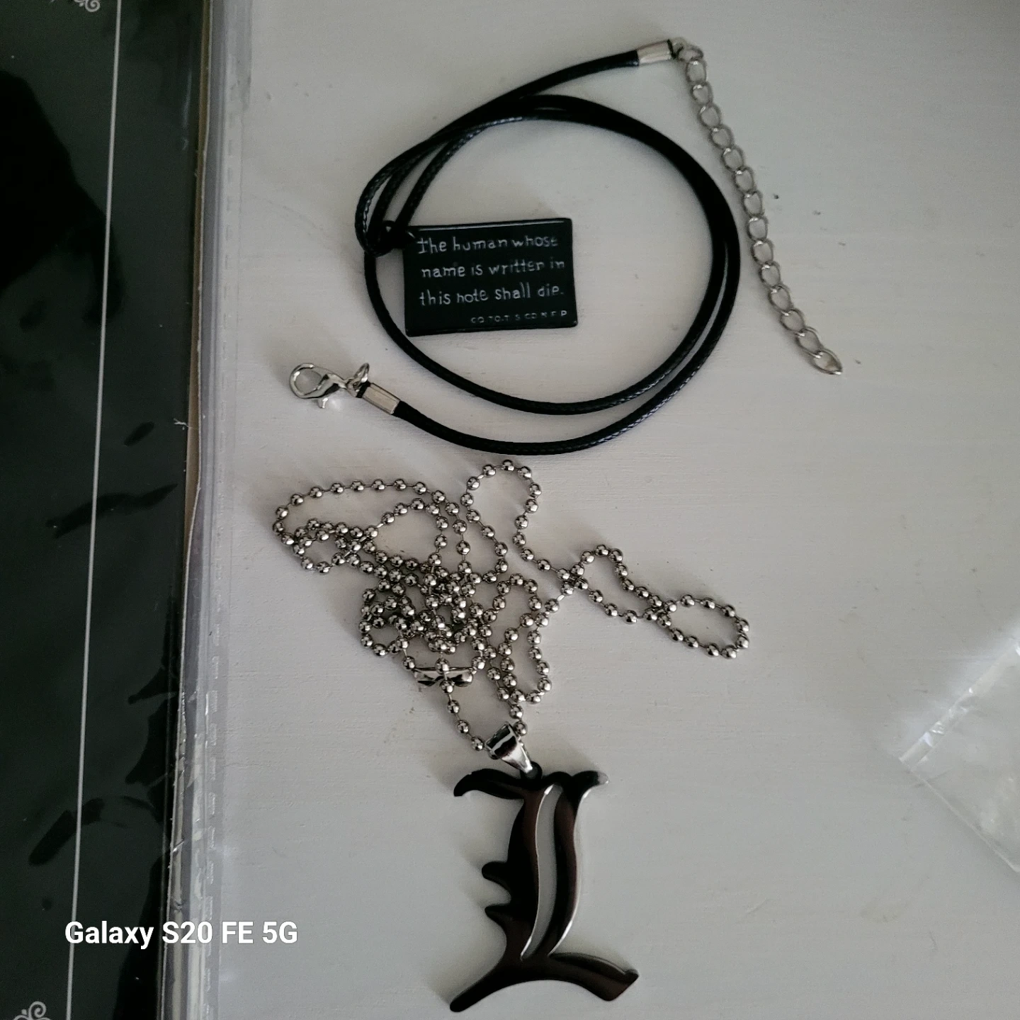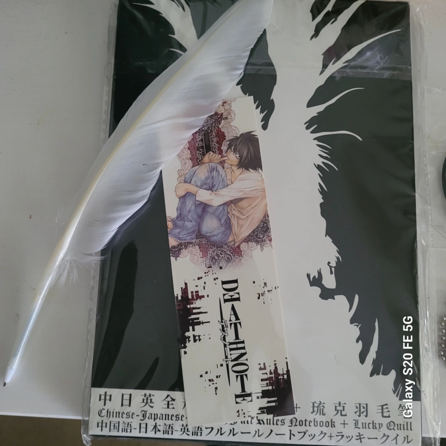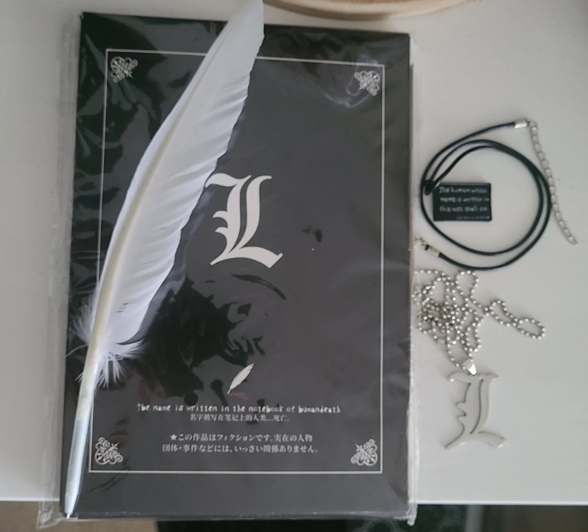 Selling a Death Note notebook set, which includes a notebook, a quill, and two necklaces! It's still in its original packaging, so it's in new condition. A great gift for any Death Note fan!