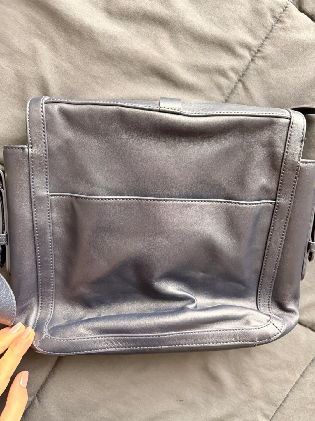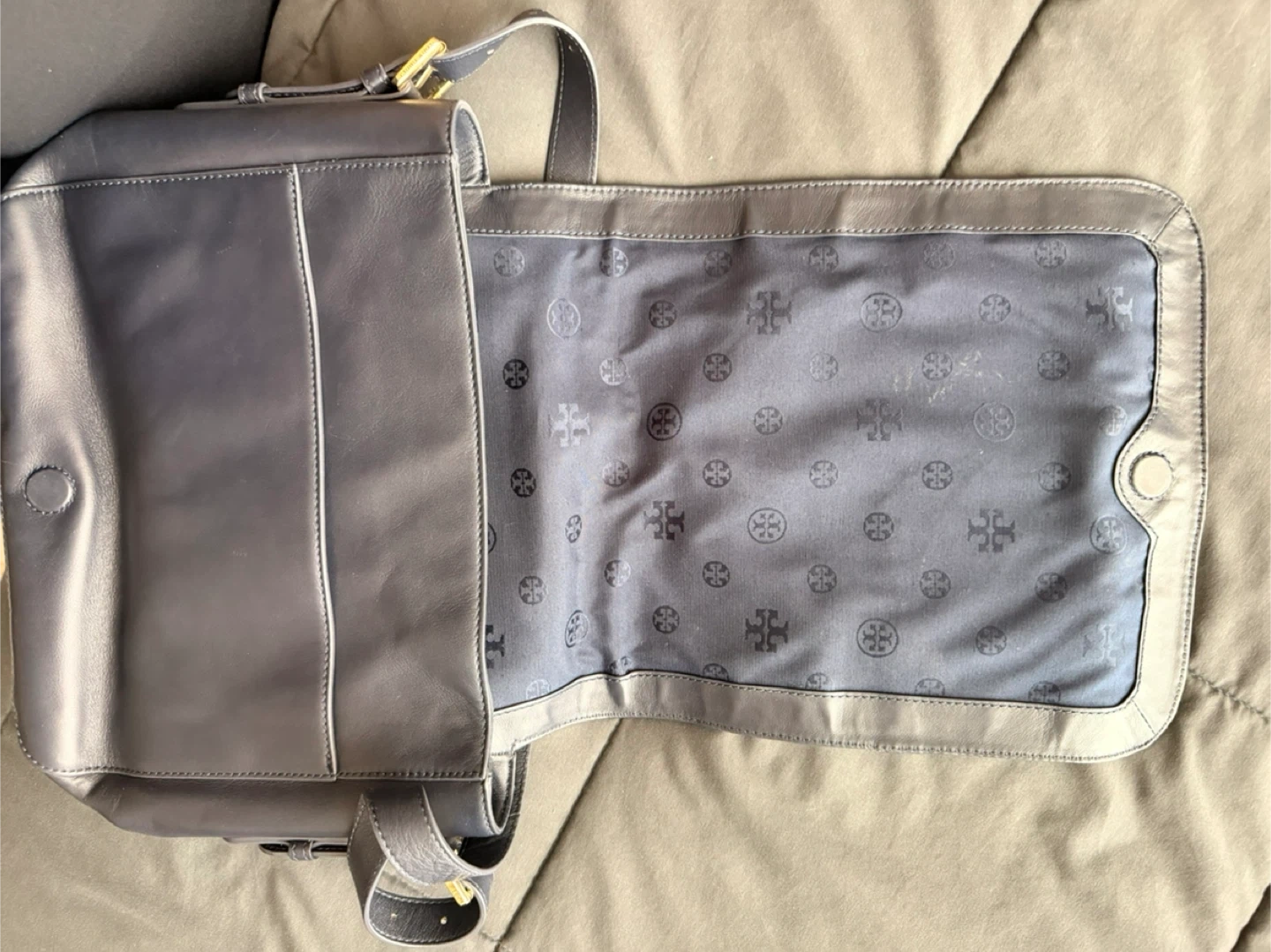 This Tory Burch bag is made of dark blue leather. It features the signature Tory Burch logo on the front and a patterned interior lining with a zippered pocket. A classic and stylish addition to any outfit!