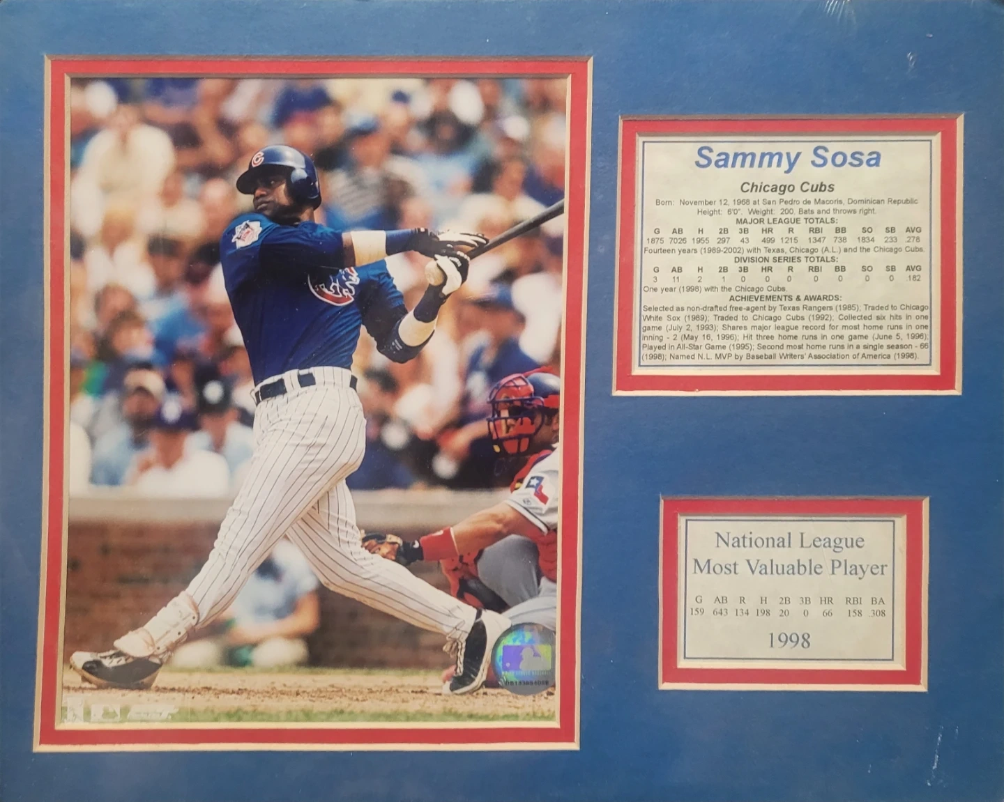 Framed memorabilia featuring Sammy Sosa of the Chicago Cubs. Includes his career statistics and National League Most Valuable Player award from 1998. It's a great piece for any baseball fan!