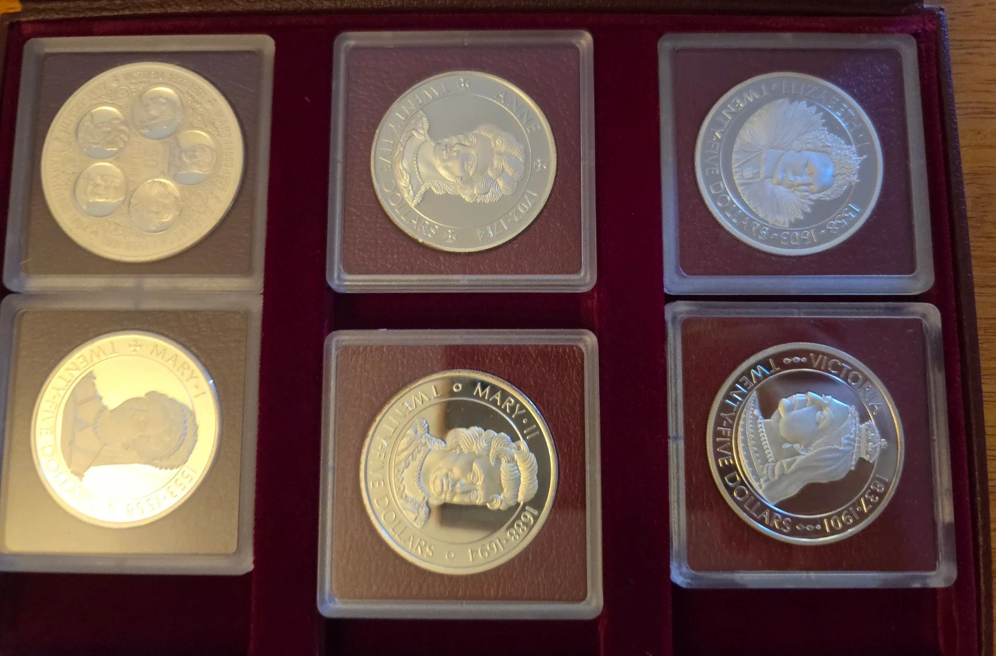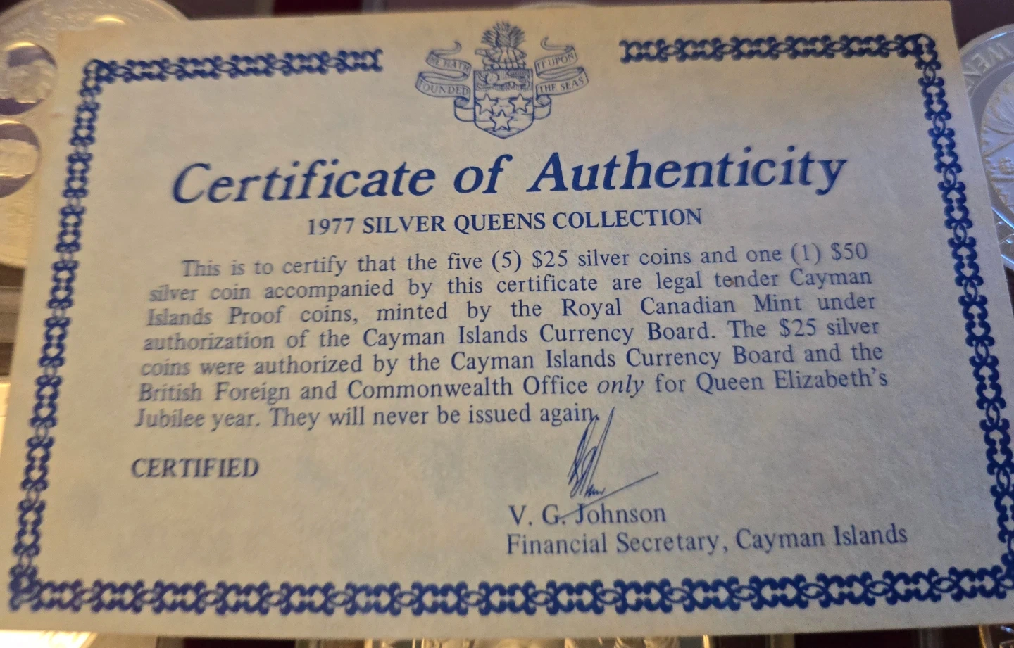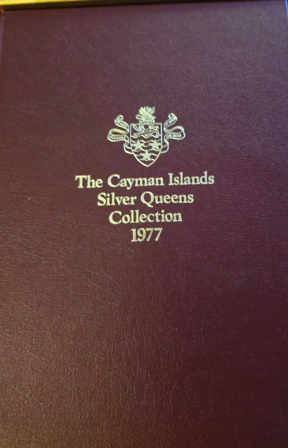This is a 1977 Cayman Islands Silver Queens Collection. It includes five $25 silver coins and one $50 silver coin. The coins were minted by the Royal Canadian Mint. They were issued only for Queen Elizabeth's Jubilee year. The collection is composed of .925 silver and has a total actual silver weight of over 9.5 ounces.