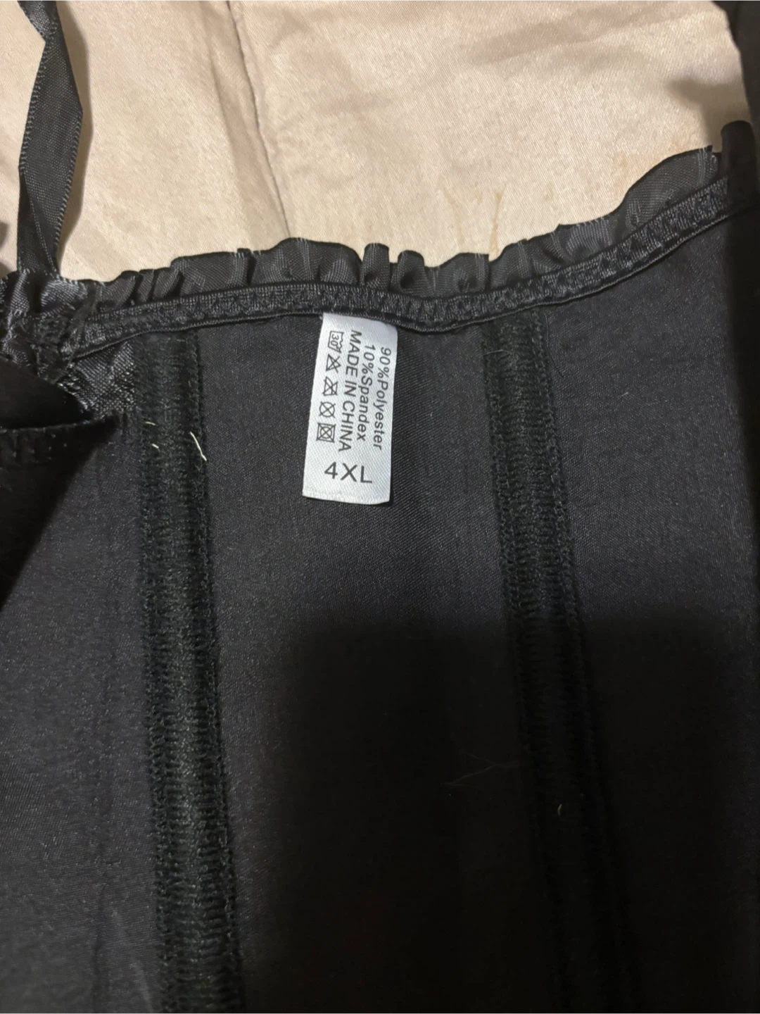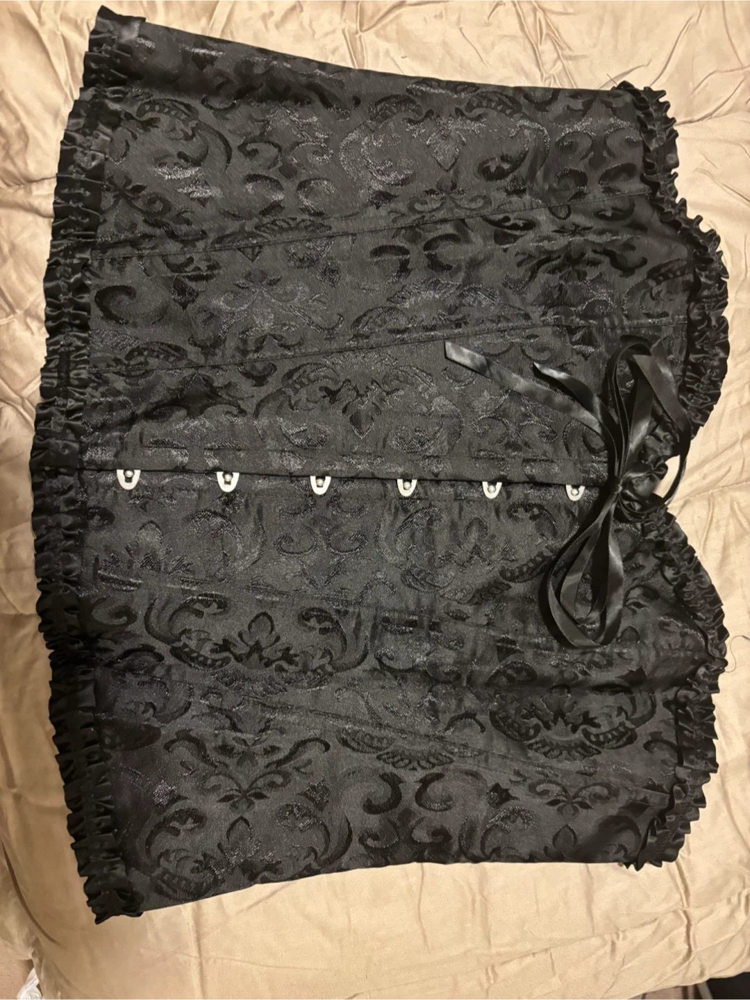 Selling a black corset top in size 4XL. The material is 90% polyester and 10% spandex. It has a beautiful floral pattern and ruffle trim. Perfect for a night out or adding a touch of elegance to any outfit!