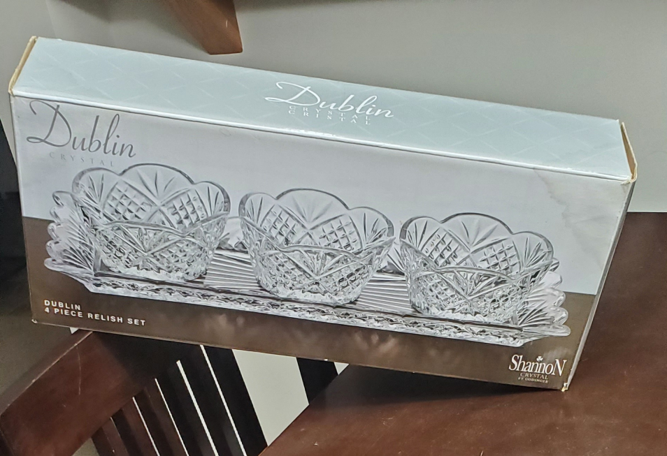 New in box. Elegant crystal relish set. Includes three small bowls and a serving tray. Timeless design. Perfect for entertaining. Delivery is available on little bit of gas money.
