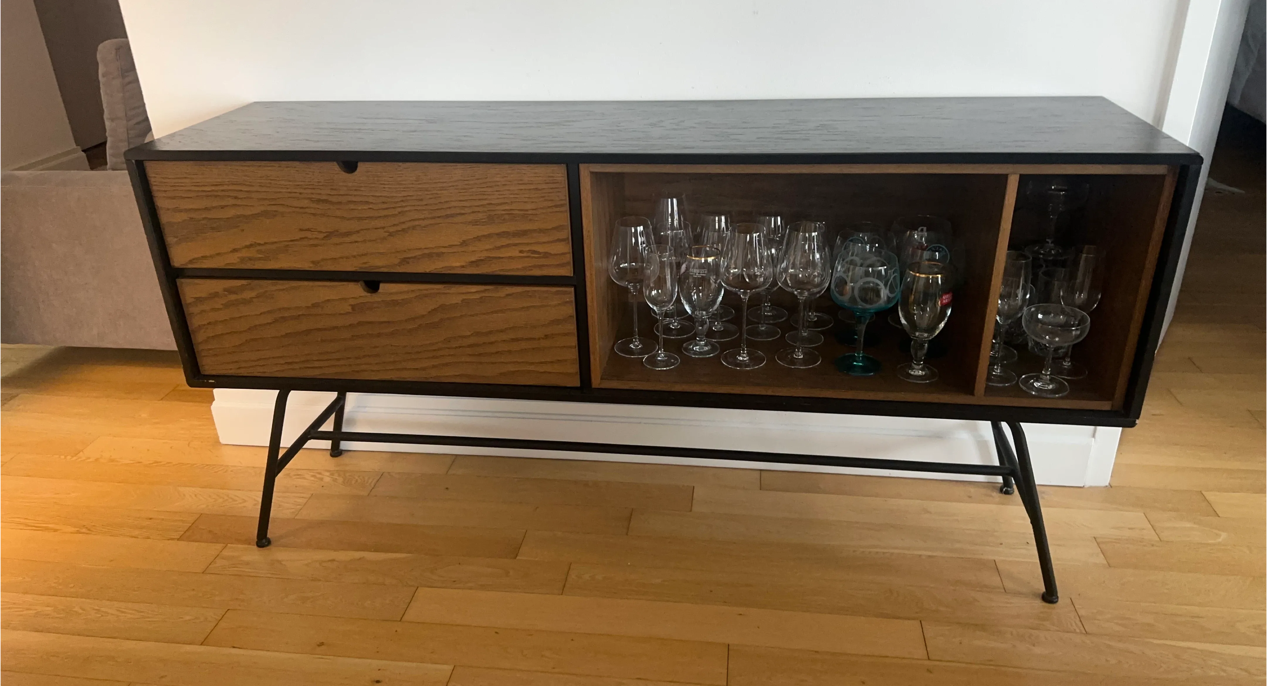 This stylish sideboard features a dark wood veneer finish with natural oak drawer fronts and an open shelving section. It's supported by sleek black metal legs, offering ample storage and display space. The unit includes two drawers and a divided open compartment, perfect for organizing essentials or showcasing glassware.