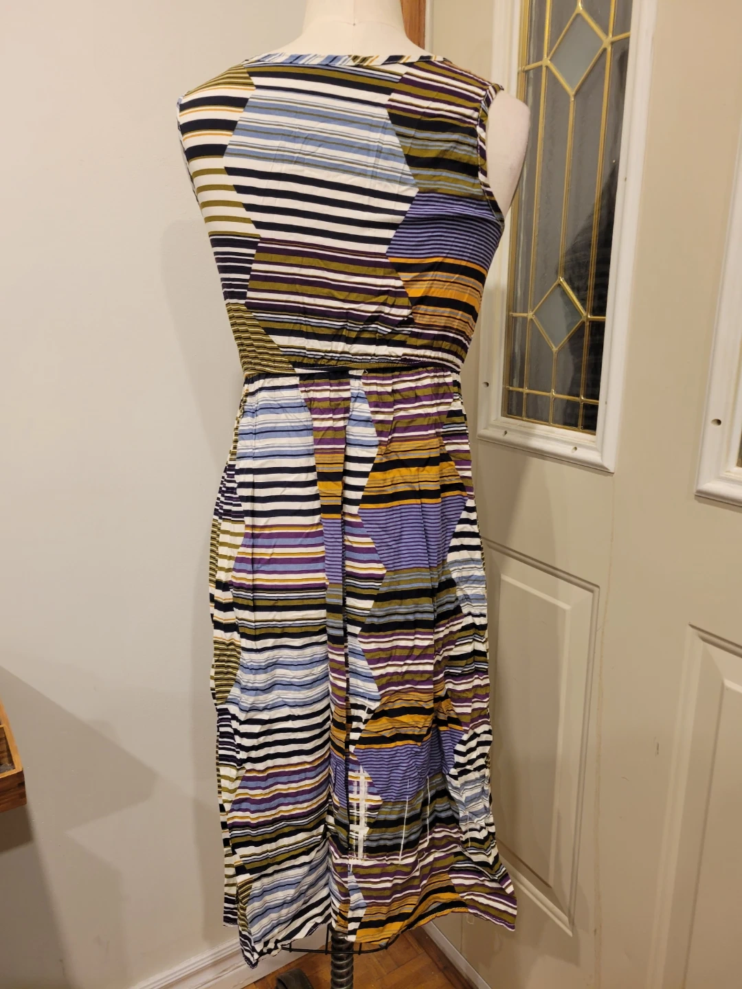 This colourful striped sleeveless maxi dress size small features a gathered waist. It's made from a soft, stretchy fabric. It's great for casual wear or a day out! Meetup location eglinton and dufferin area