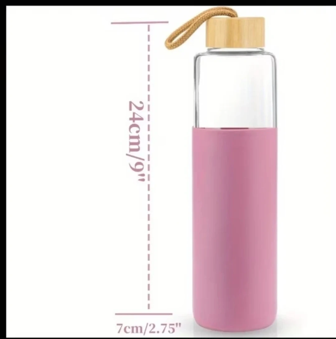 Reusable glass water bottle with a protective sleeve. It's 24cm tall and 7cm wide. Features a bamboo lid and a convenient carrying loop.