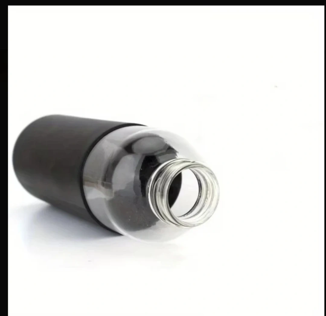 Reusable glass water bottle with a protective sleeve. It's 24cm tall and 7cm wide. Features a bamboo lid and a convenient carrying loop.