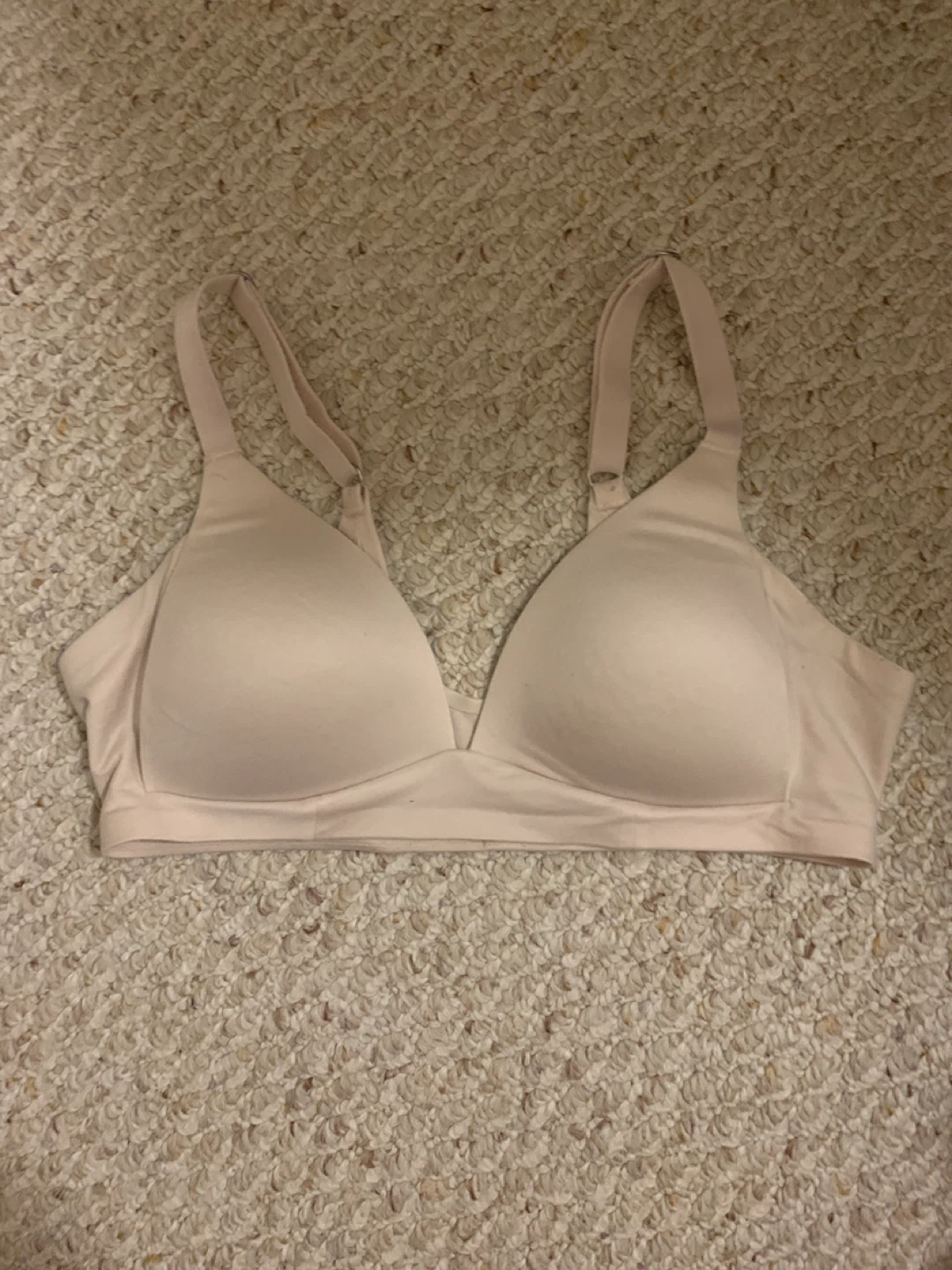 This is a light pink wirefree bra. It's a comfortable option for everyday wear. Features adjustable straps for a custom fit. The material is soft and breathable.