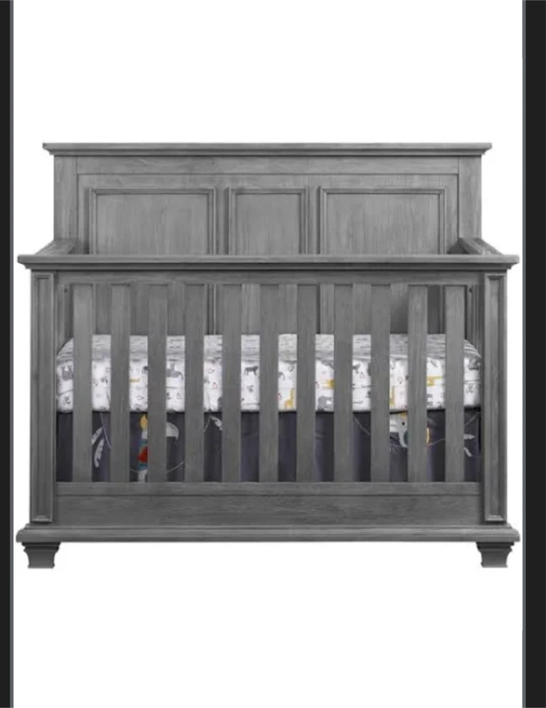 This is a sturdy wooden crib in a grey finish. It features a classic design with decorative panels. Crib bedding is included. This crib is a great addition to a nursery. This bed is convertible too.