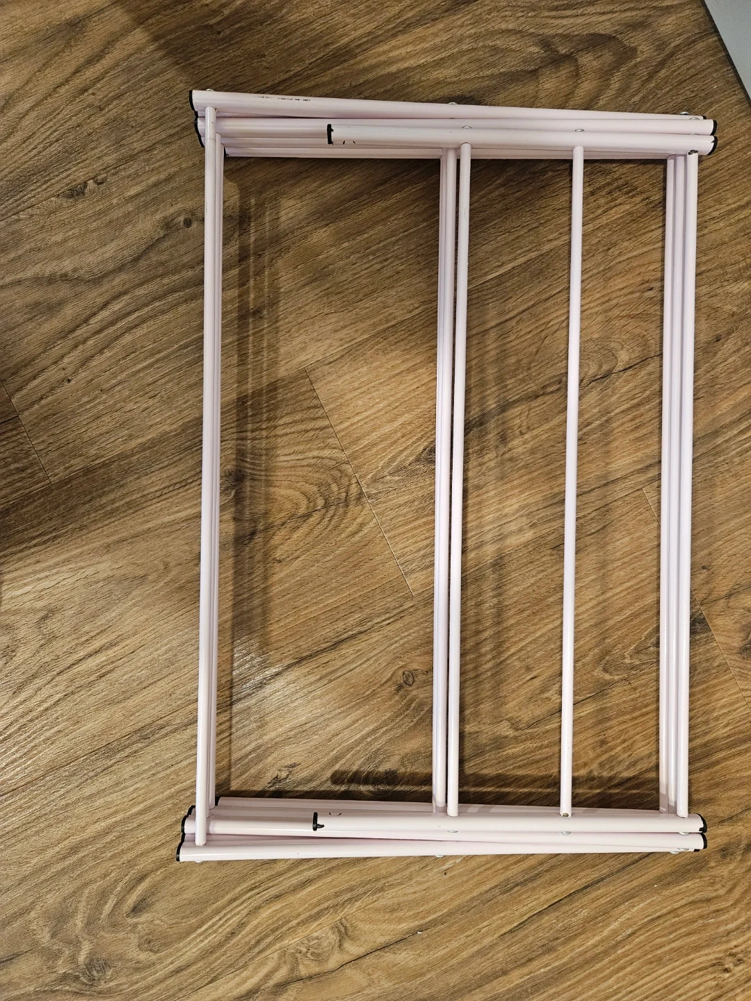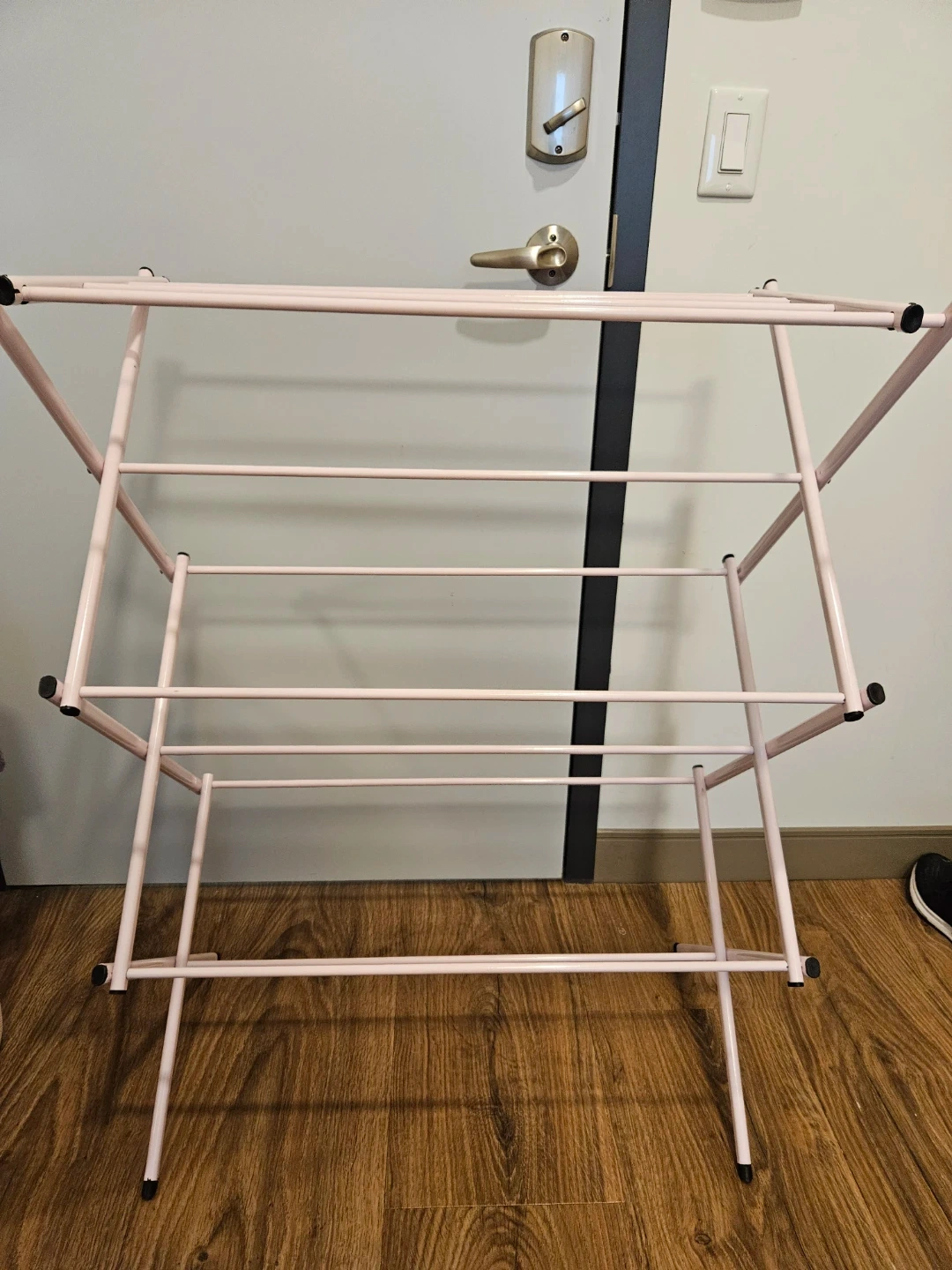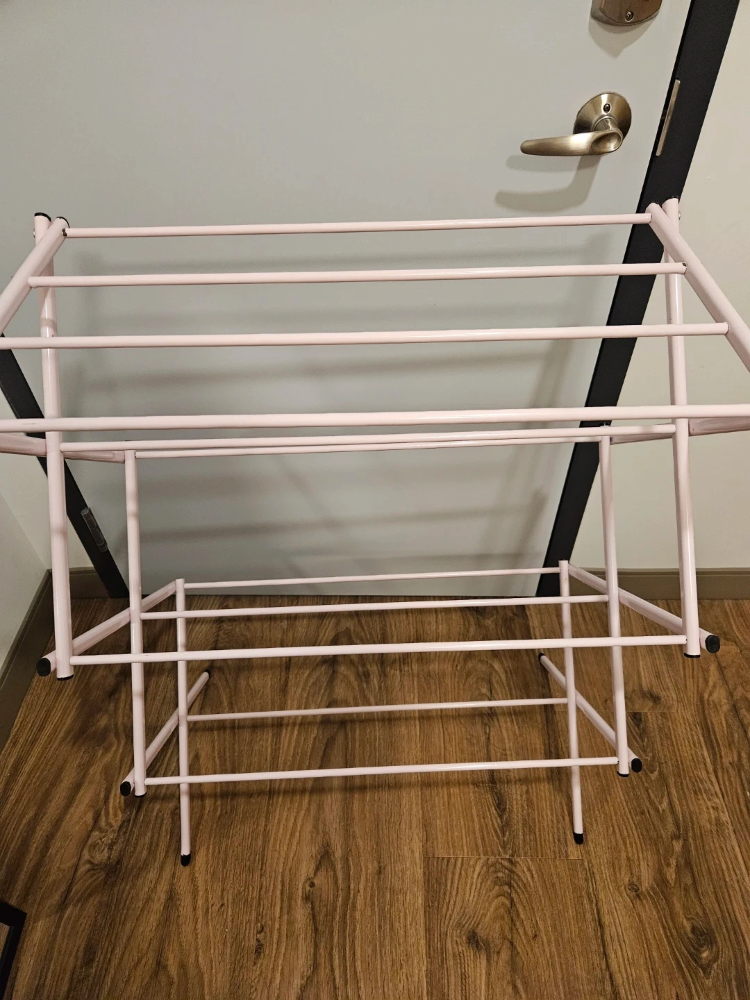 Light pink metal drying rack for laundry. Great for use in a dorm or extra drying space at home! Still works perfectly, just some minor paint chips. Roughly 38in tall and 28.5in wide. Collapses/folds for easy storage.