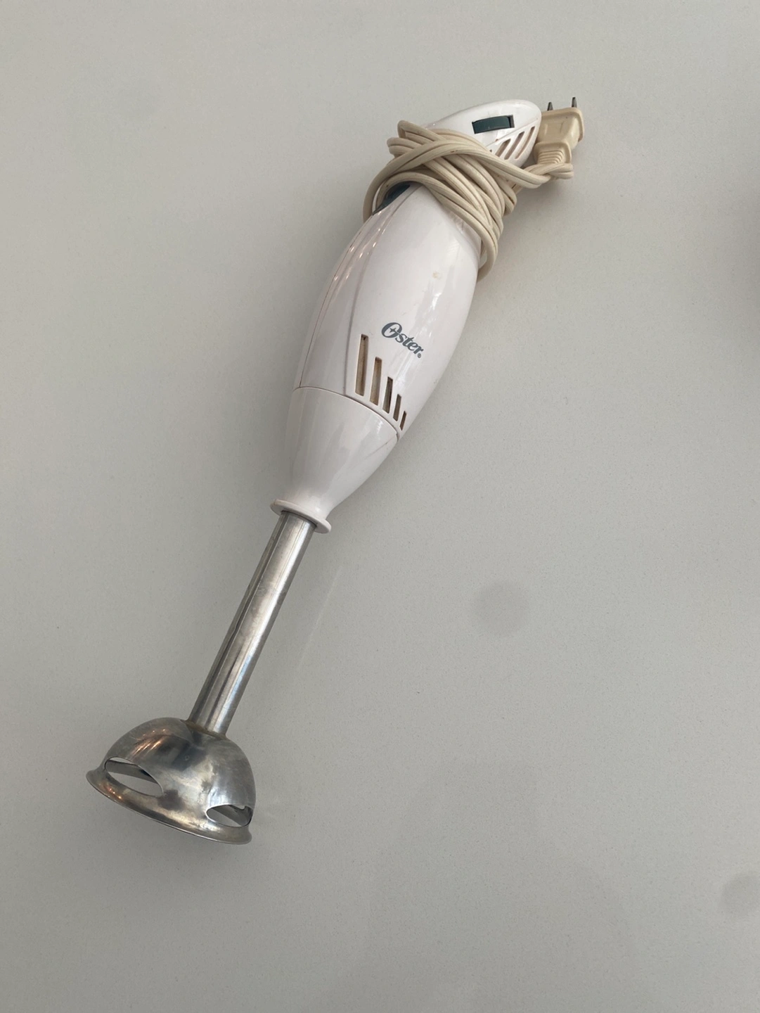 Used Oster immersion blender. Includes the main unit, immersion blending arm, and a small food processor attachment. Good working condition.