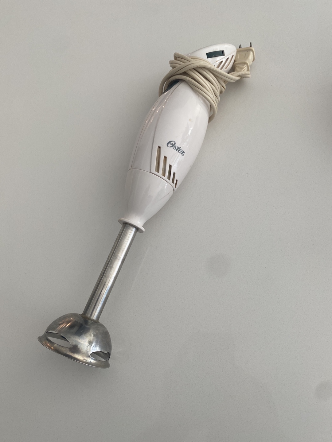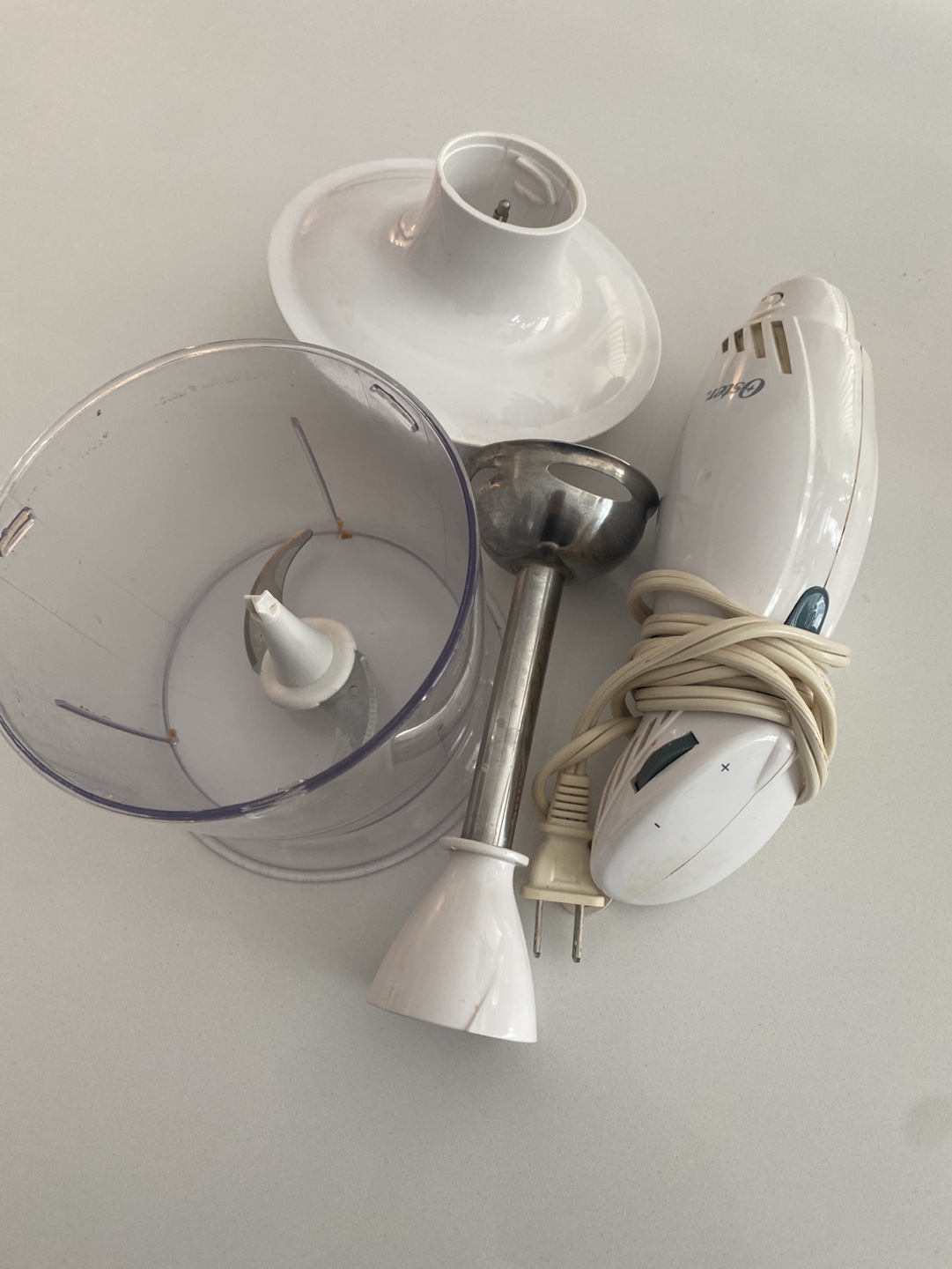 Used Oster immersion blender. Includes the main unit, immersion blending arm, and a small food processor attachment. Good working condition.