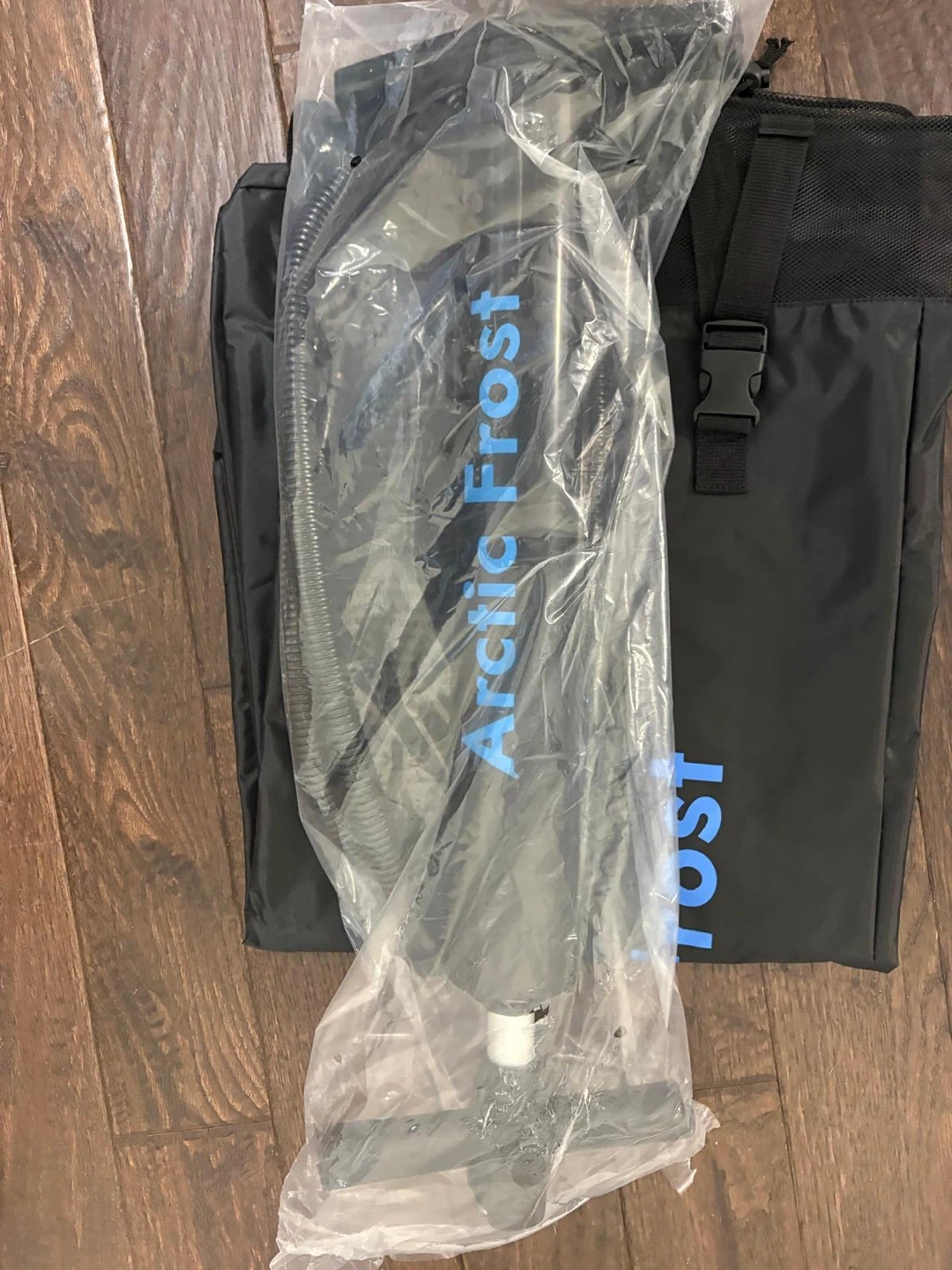Arctic Frost inflatable ice bath tub. It comes with an air pump and a storage bag. Setup instructions are included.