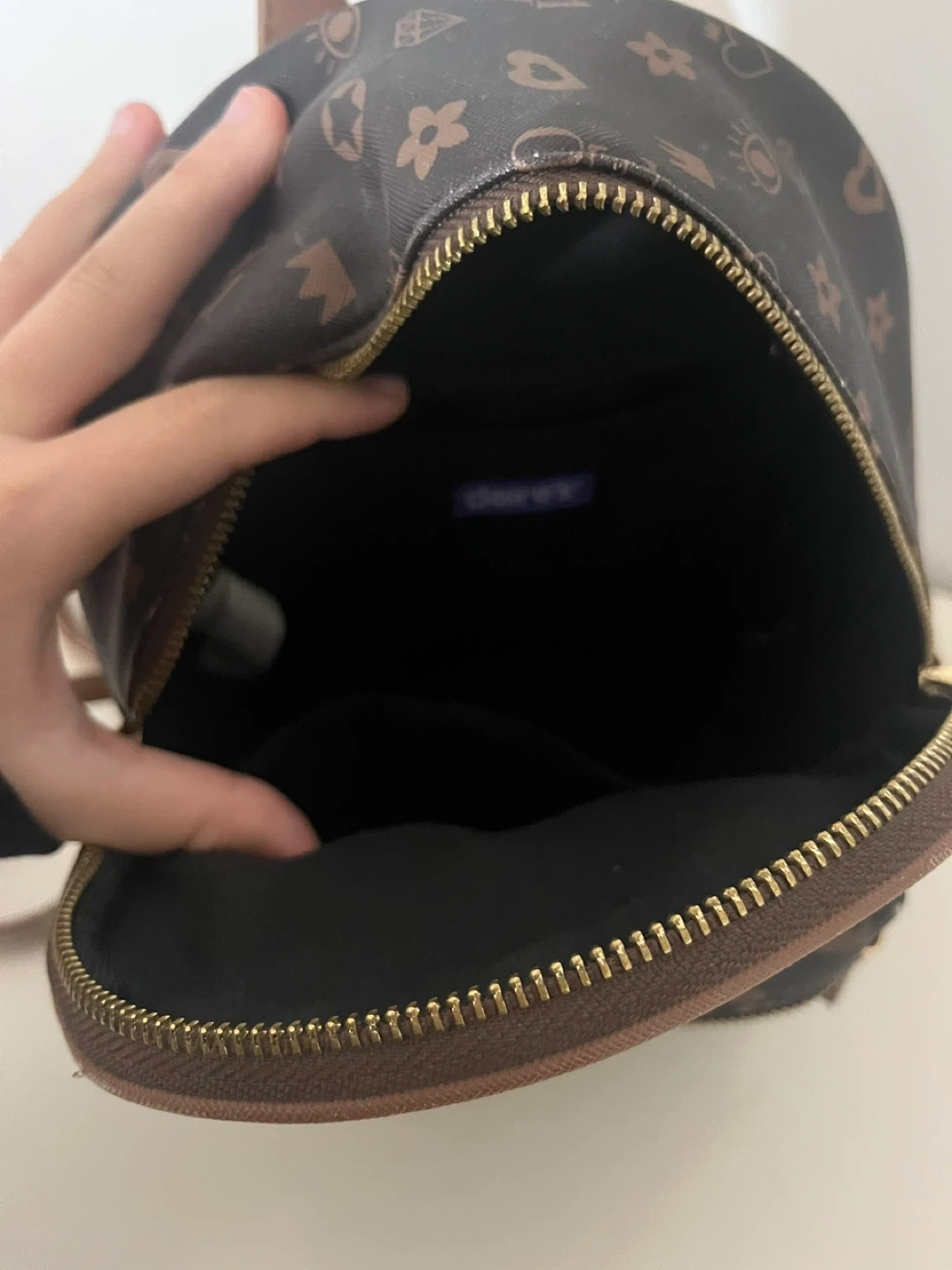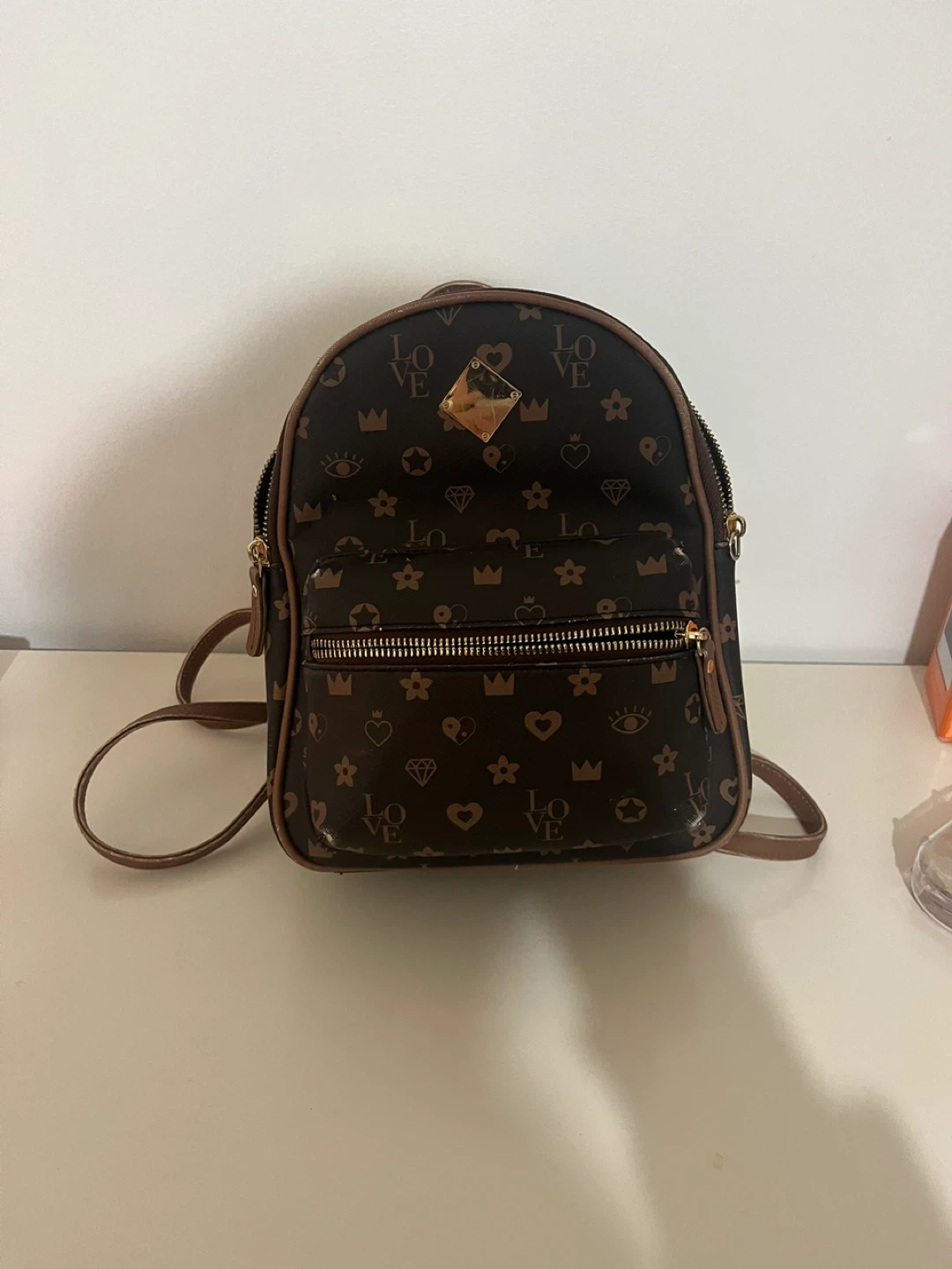 This is a cute mini backpack from Claire's! It features a dark brown colour with a fun all-over print. Perfect for carrying your essentials in style!