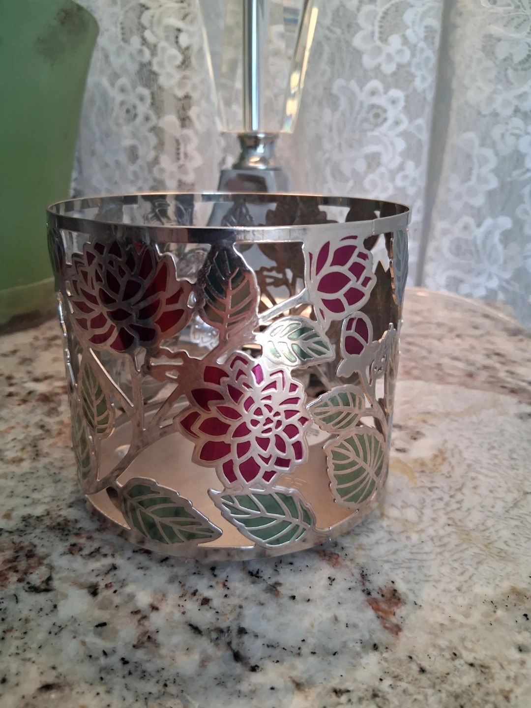 Silver-toned metal candle holder featuring a cut-out floral and leaf design. It fits a standard 3-wick candle. This piece adds a touch of elegance to any room.