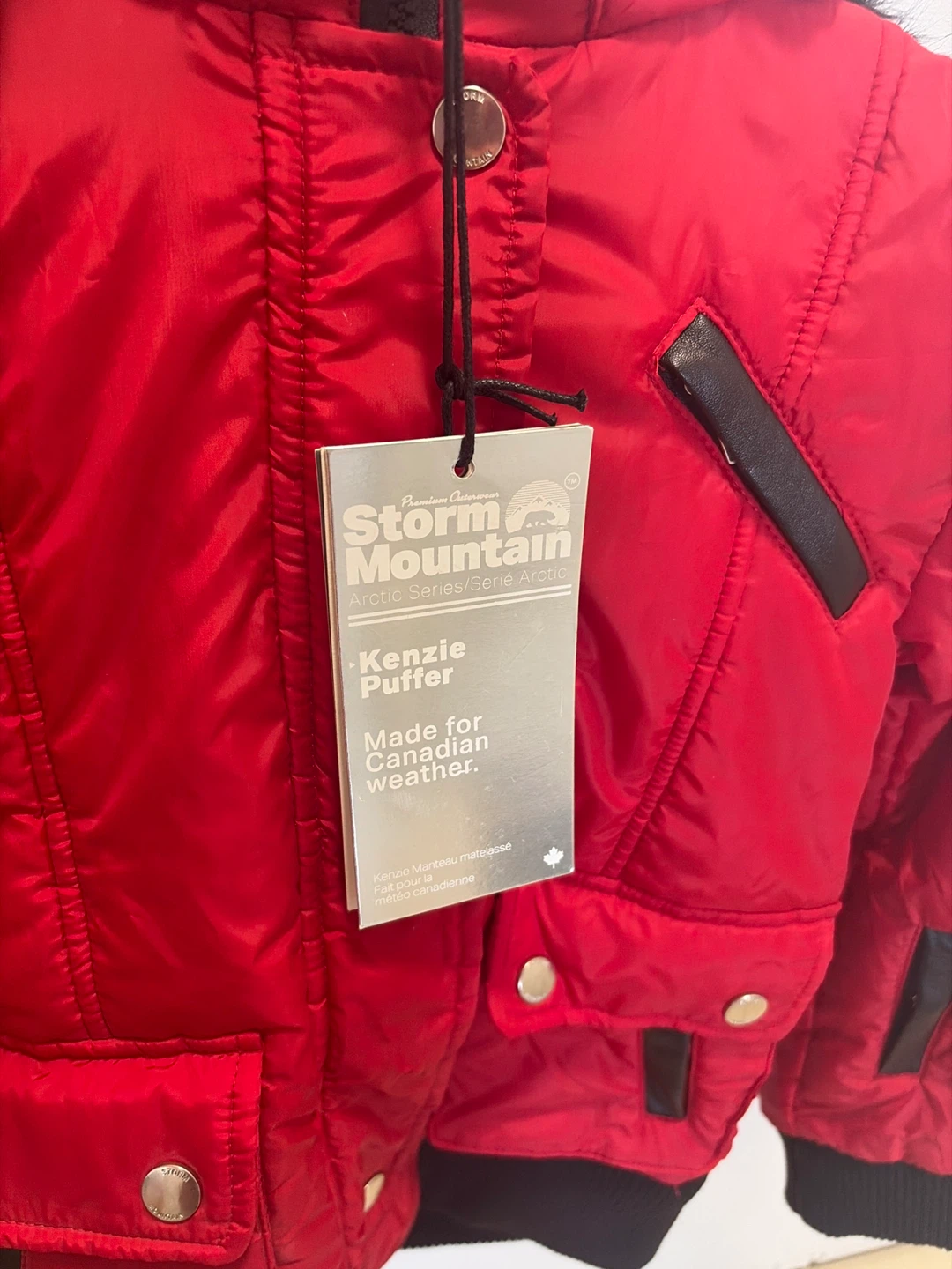 This Storm Mountain Arctic Series Kenzie Puffer jacket is made for Canadian weather. It's a size S/P (7/8) with a red exterior and black trim. The hood is lined with faux fur. It's proudly developed in Canada and was originally priced at $79.99.