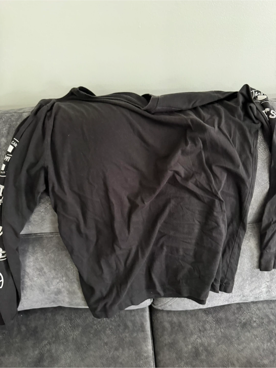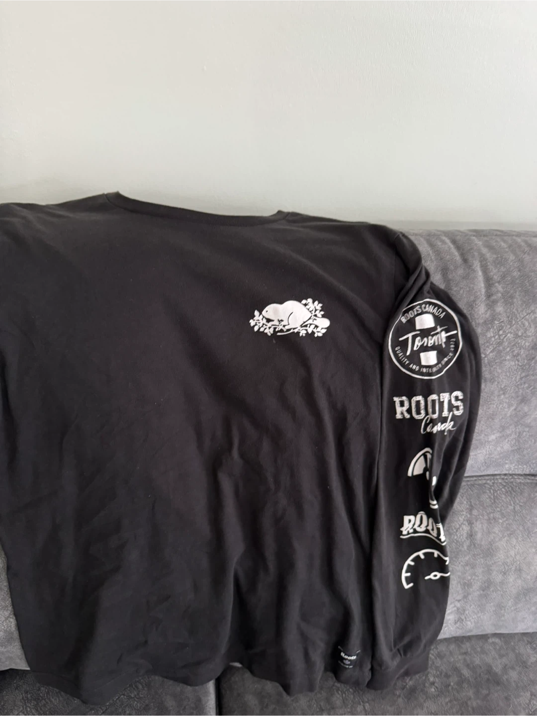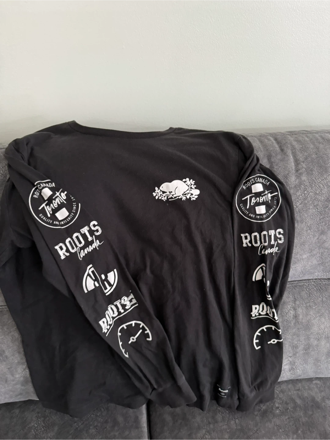 Black long sleeve t-shirt from Roots Canada. It's a size medium/M. The shirt has graphic detailing on the sleeves and a logo on the front.