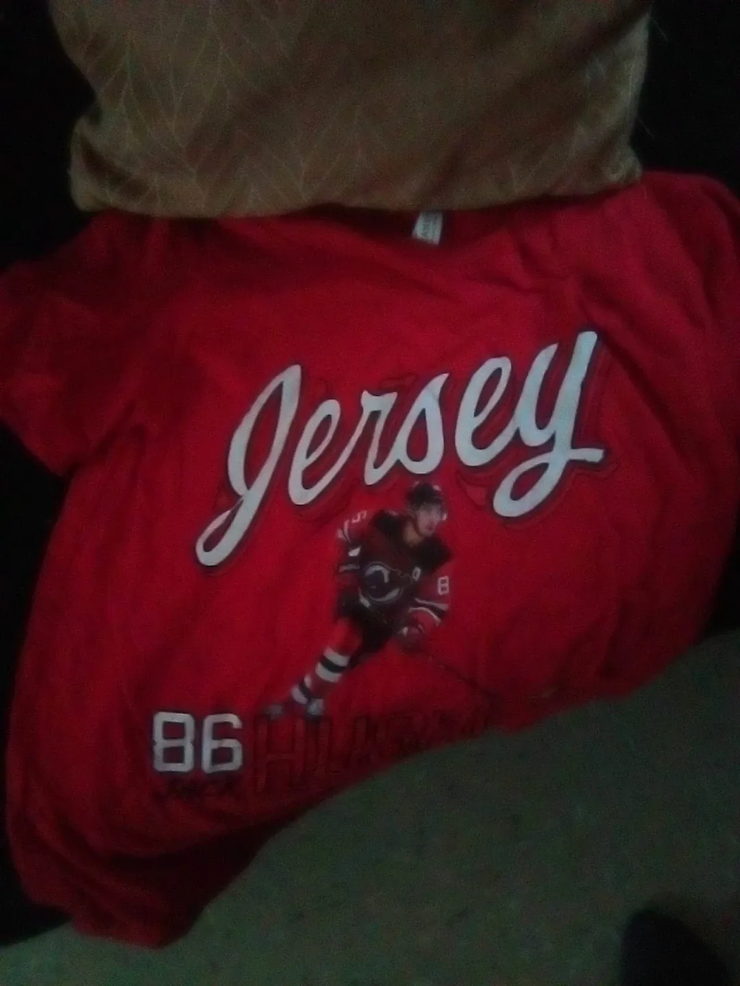 This red hockey jersey features the word 'Jersey' in large white script across the chest. A graphic of a hockey player in action is also printed on the front, with the number '86' visible. It's made from a soft material.