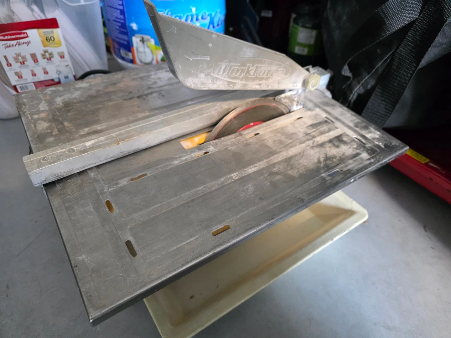 WorkForce wet tile saw for cutting tiles. It has a metal body and includes a water tray. This saw is great for DIY tiling projects. Ask 45$