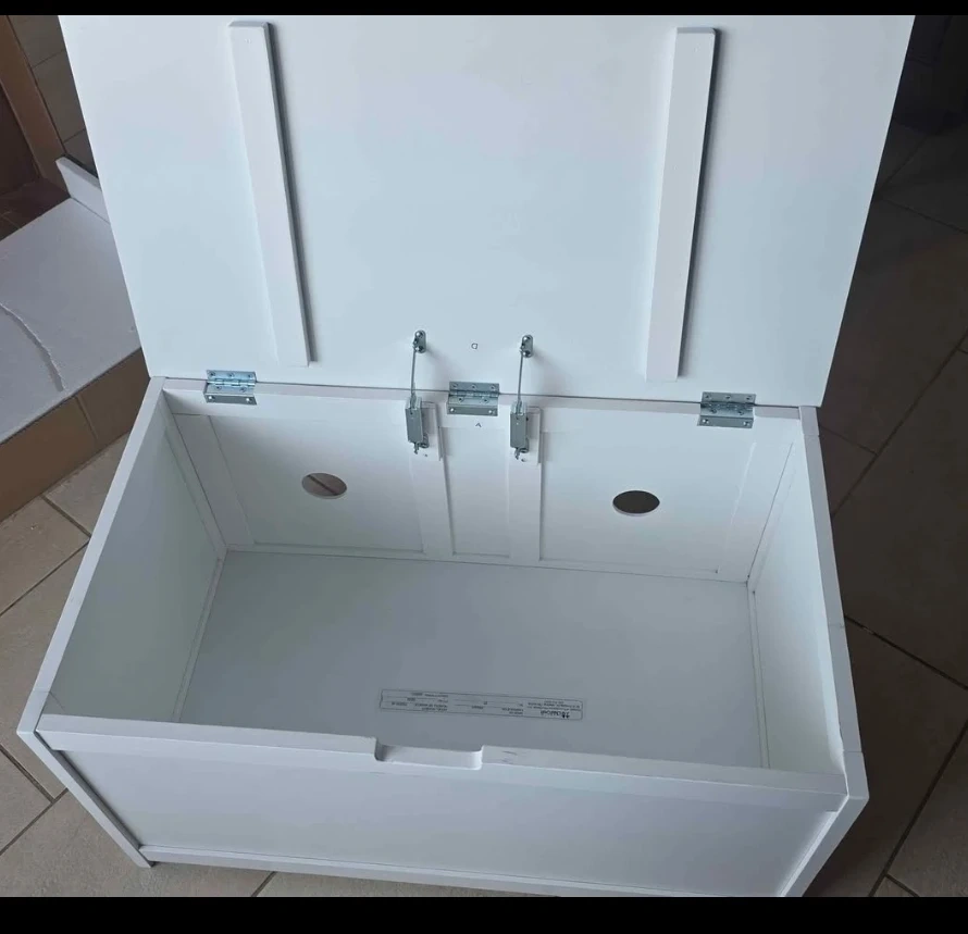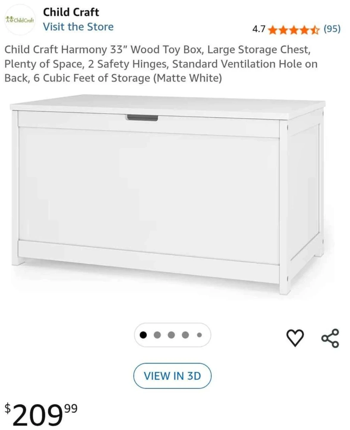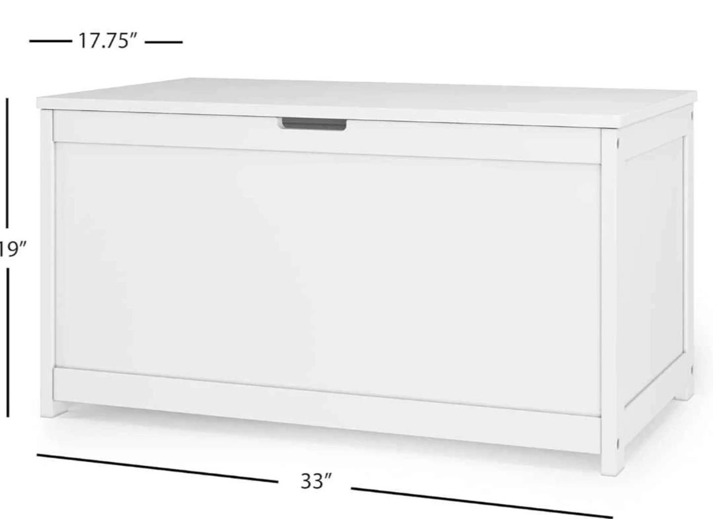 This Child Craft Harmony toy box is 33 inches wide and made of wood with a matte white finish. It features 2 safety hinges for a soft close and a standard ventilation hole on the back. Plenty of space with 6 cubic feet of storage.