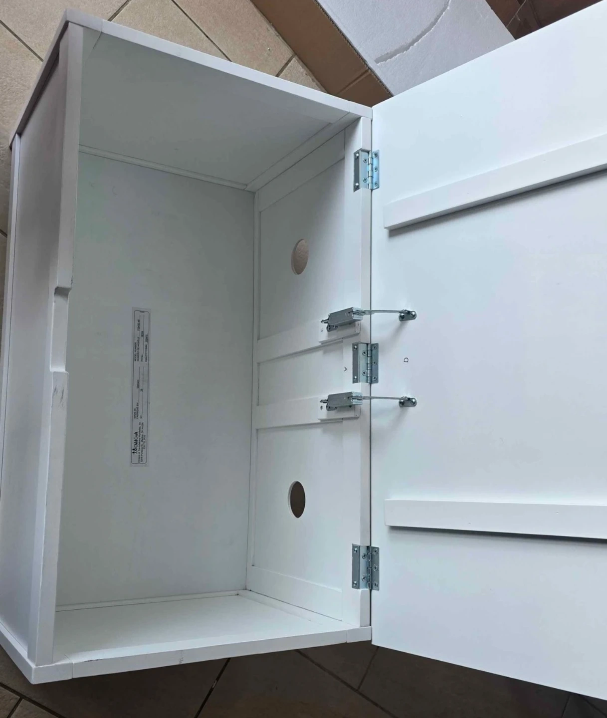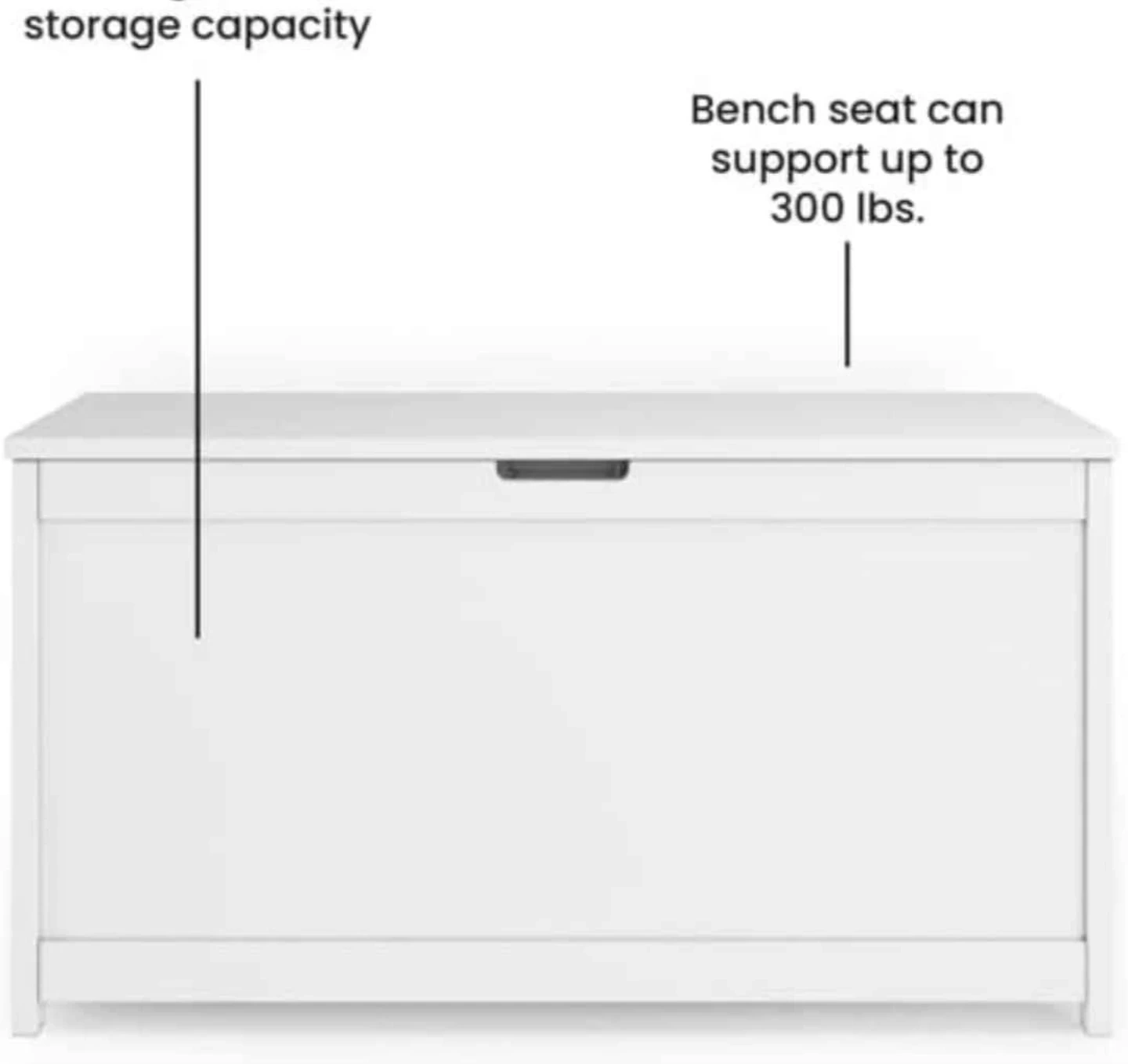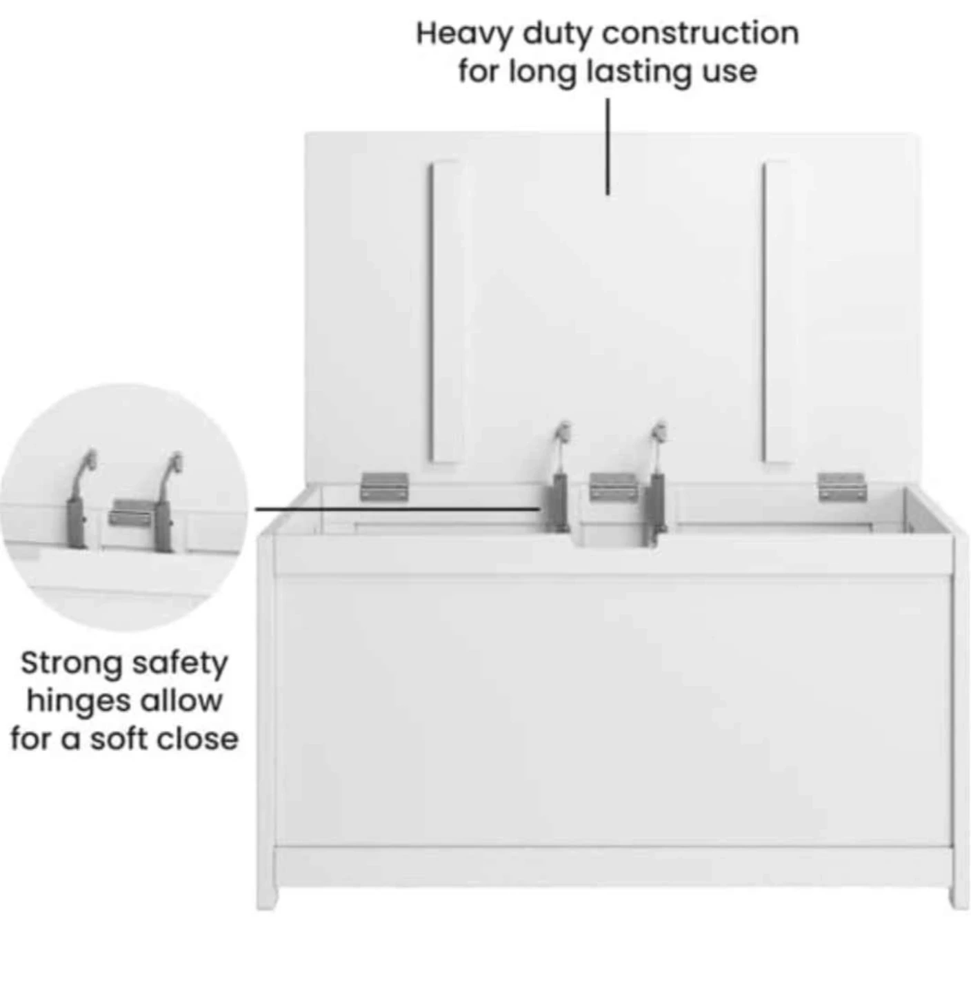 This Child Craft Harmony toy box is 33 inches wide and made of wood with a matte white finish. It features 2 safety hinges for a soft close and a standard ventilation hole on the back. Plenty of space with 6 cubic feet of storage.