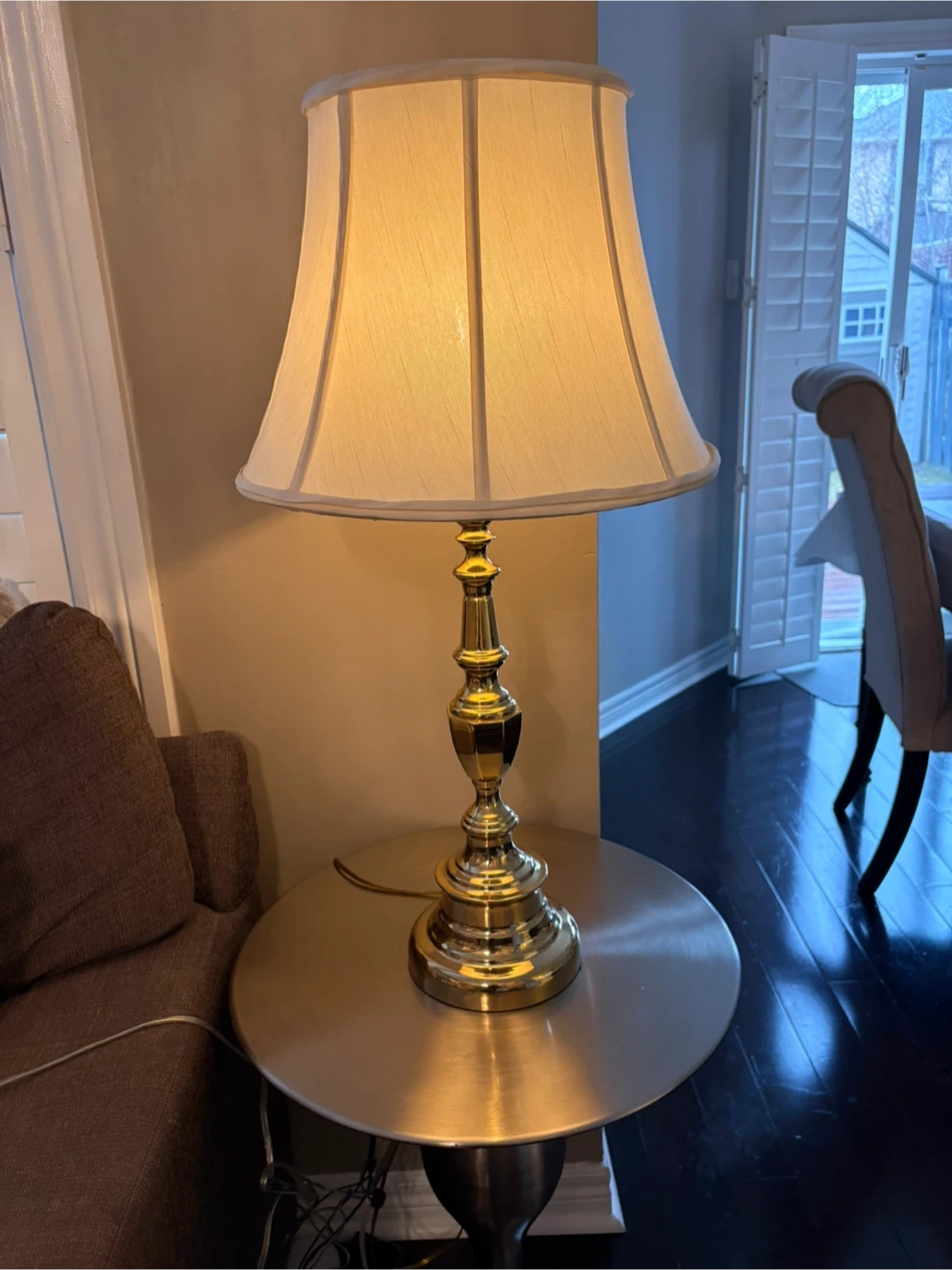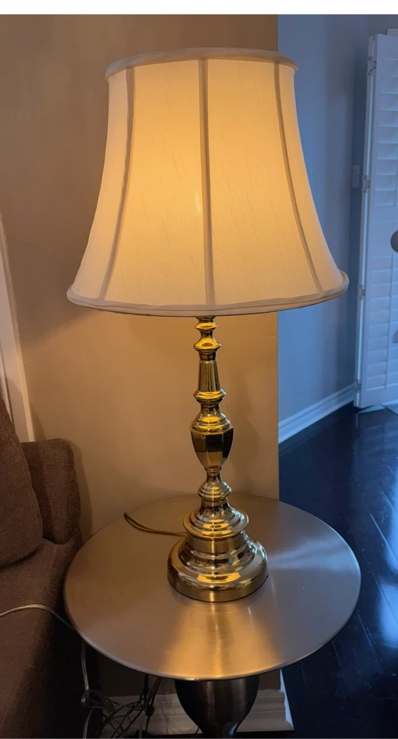 28 inches H. A classic table lamp with a polished brass base and a cream-coloured lampshade. It's a stylish addition to any room. The lamp provides warm, ambient lighting.