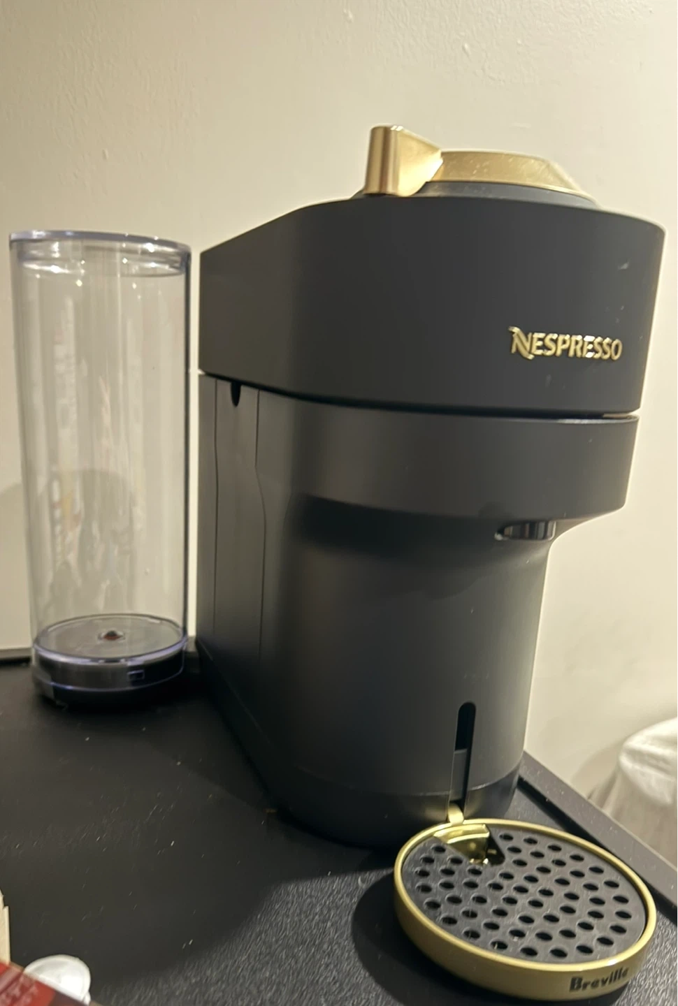 This Nespresso VertuoPlus machine brews delicious coffee. It comes with a water tank and a used capsule container. Double-walled glass mugs are also included, perfect for enjoying your hot beverages!