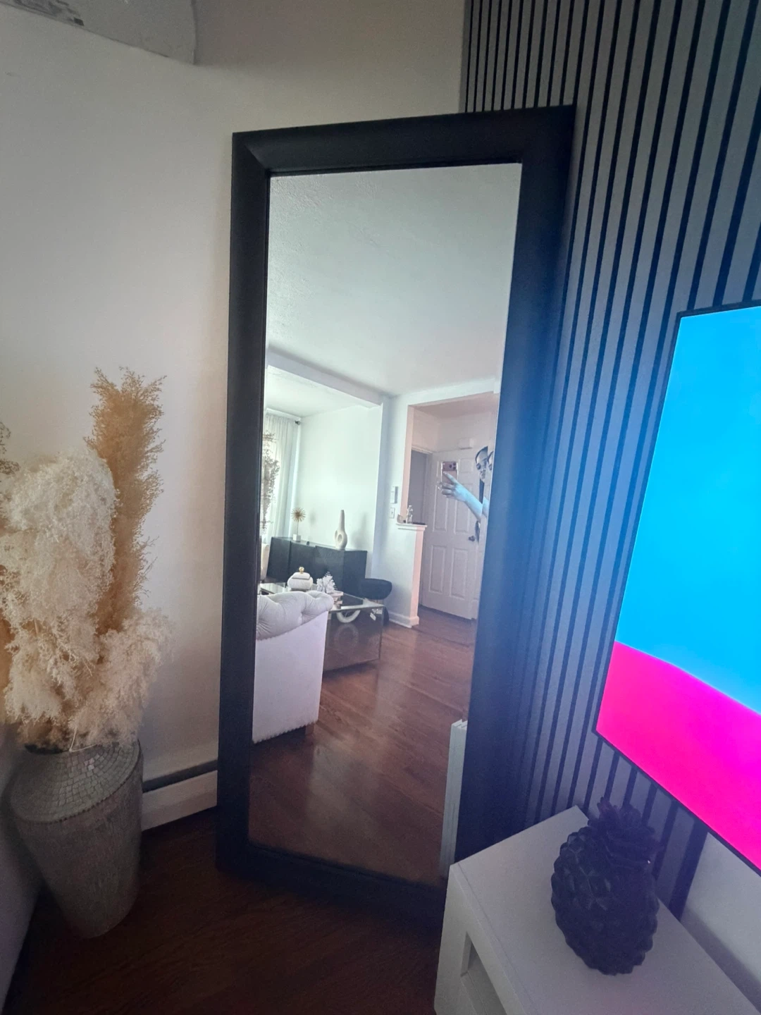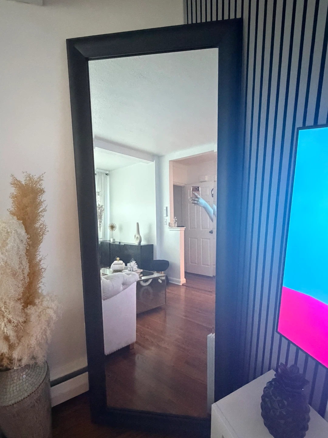 This is a full-length mirror with a sleek black frame. It's perfect for checking your outfit before heading out. The mirror has a simple, modern design that will fit into most decor styles.