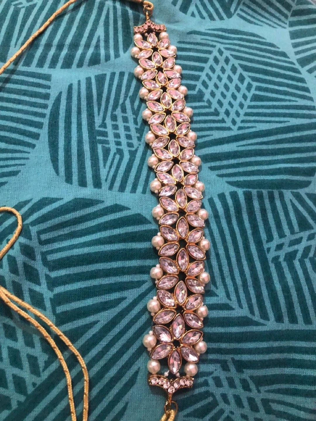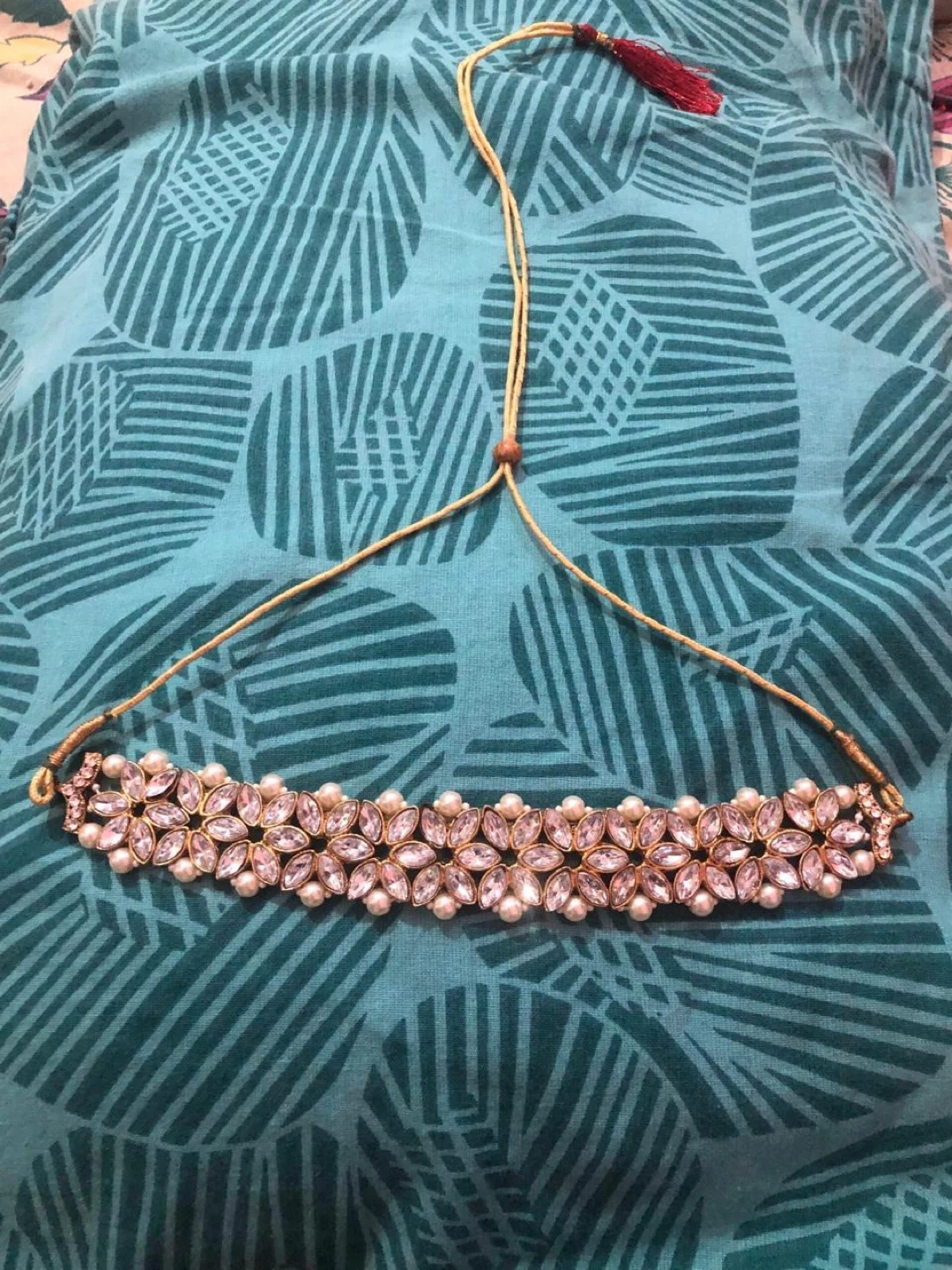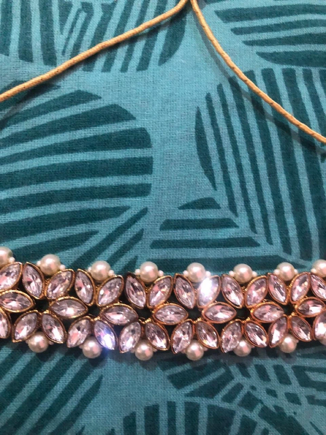 A delicate choker necklace, gold-toned with intricate floral patterns. It's adorned with clear, diamond-like crystals and small, lustrous pearls. Features adjustable ties with a red tassel for a pop of colour.