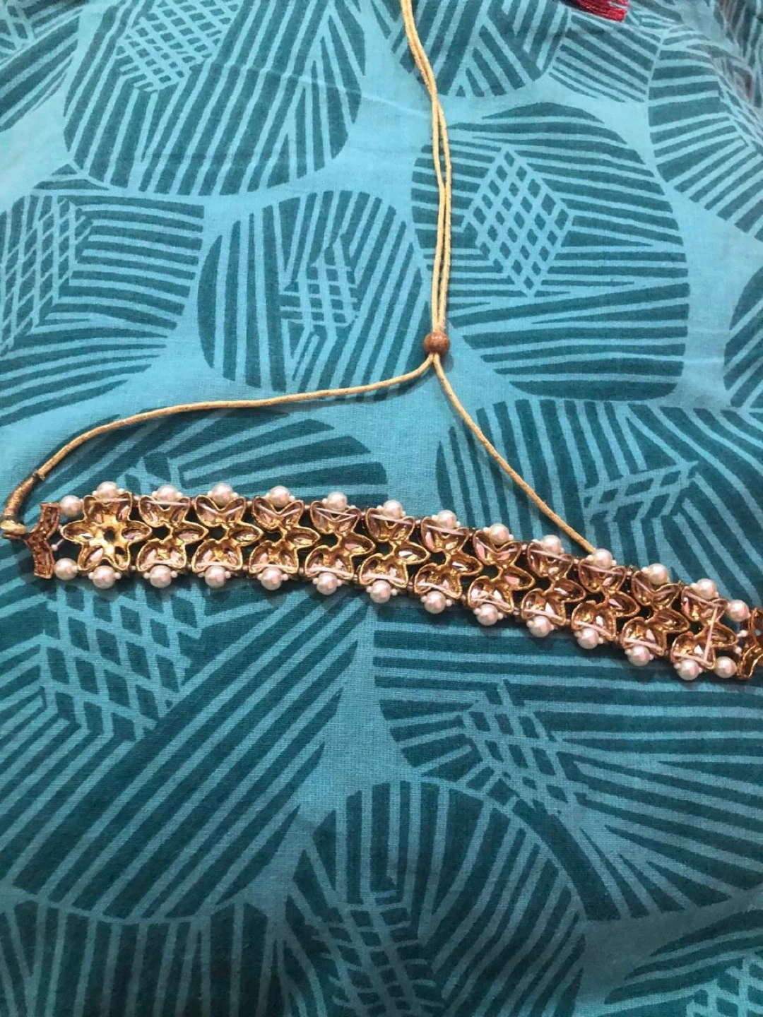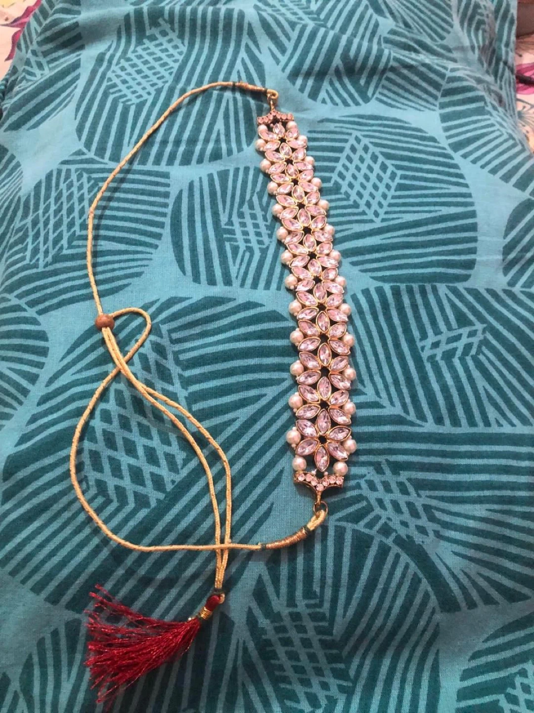 A delicate choker necklace, gold-toned with intricate floral patterns. It's adorned with clear, diamond-like crystals and small, lustrous pearls. Features adjustable ties with a red tassel for a pop of colour.