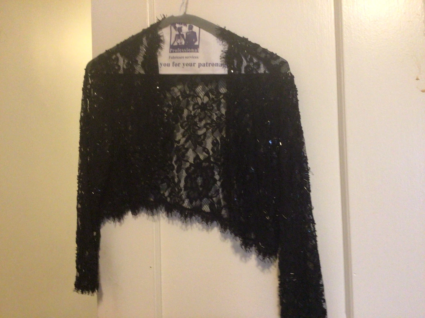 Black lace bolero jacket with sequin details. Matching black strapless formal dress with a ruched bodice and beaded waistband. Perfect for formal occasions!