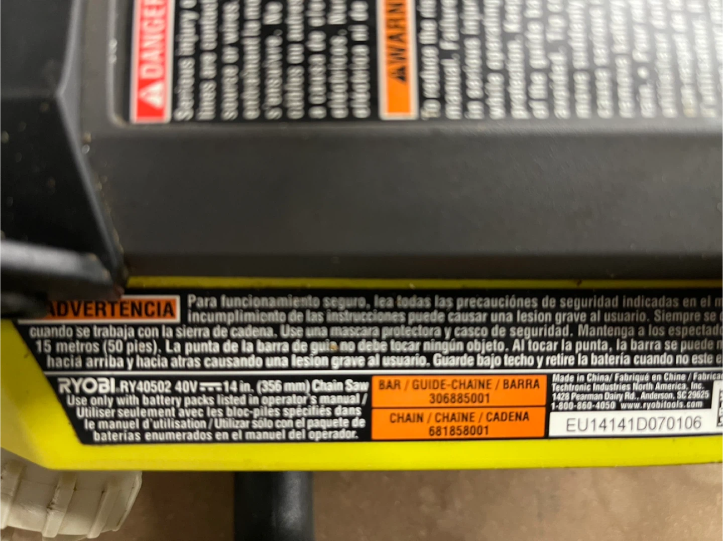 14” Ryobi 40v Chainsaw, Battery & Charger