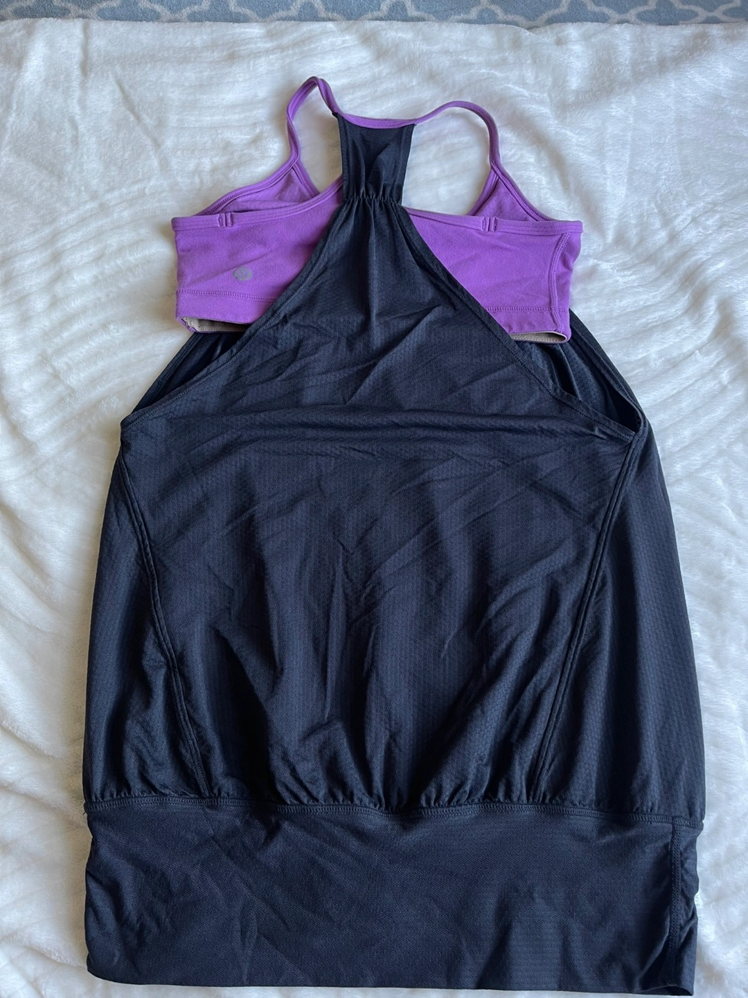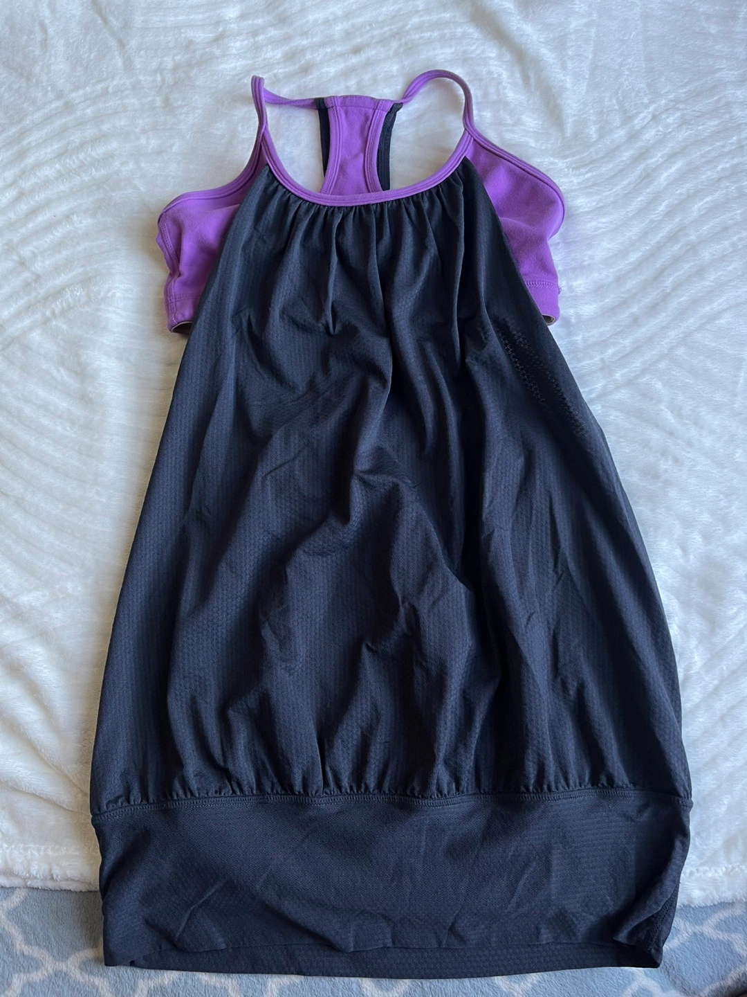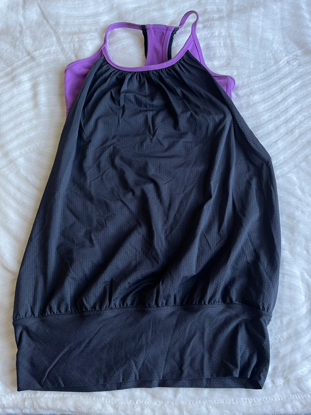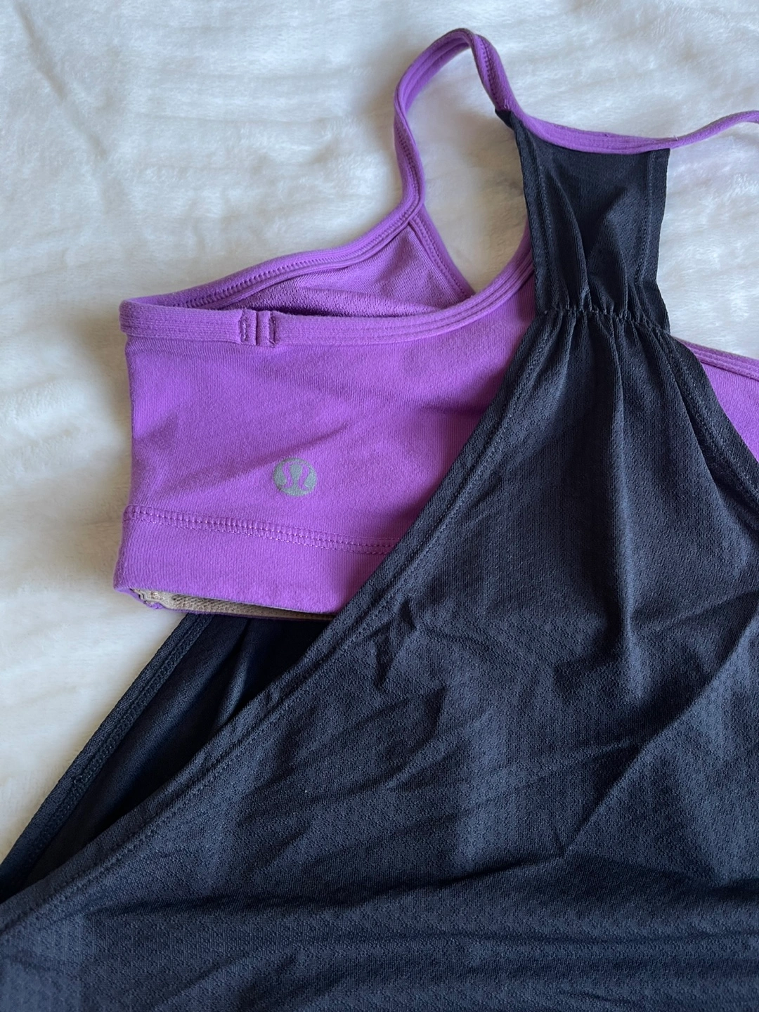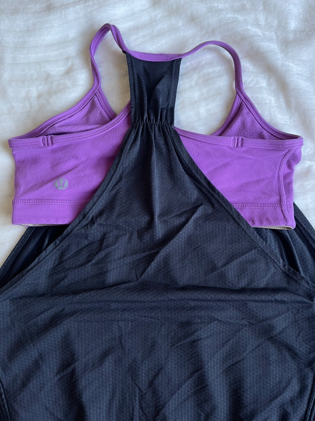 A Lululemon tank top in black and purple! It's in great condition and ready for a new home. Perfect for workouts or casual wear