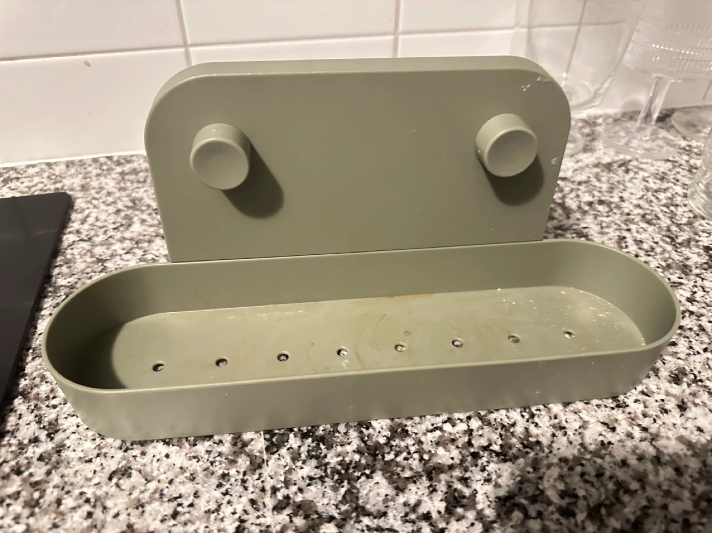 Used IKEA ÖBNAS wall shelf. Gray-green colour. Features a suction cup. Small tray for storage. Measures 28 cm (11").