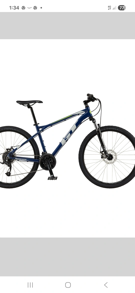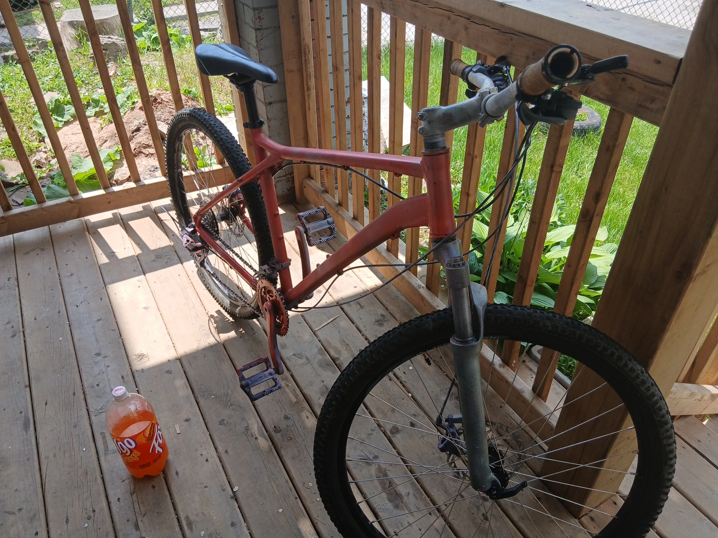 A red mountain bike, perfect for trails. Featuring a seat, handle bars, and tires. The bike has pedals and a frame. Enjoy a peaceful ride outdoors on this bike.
