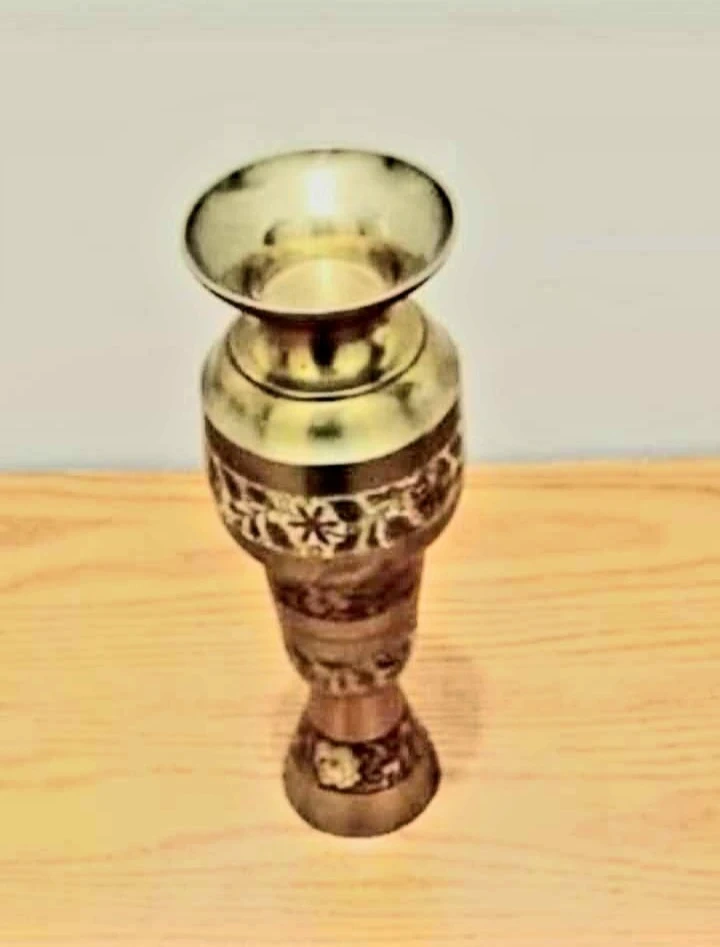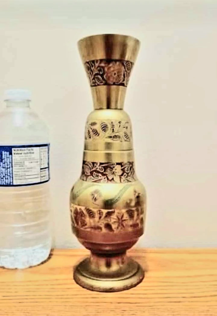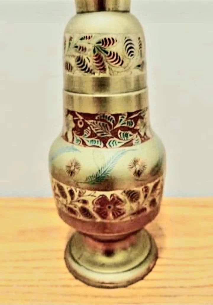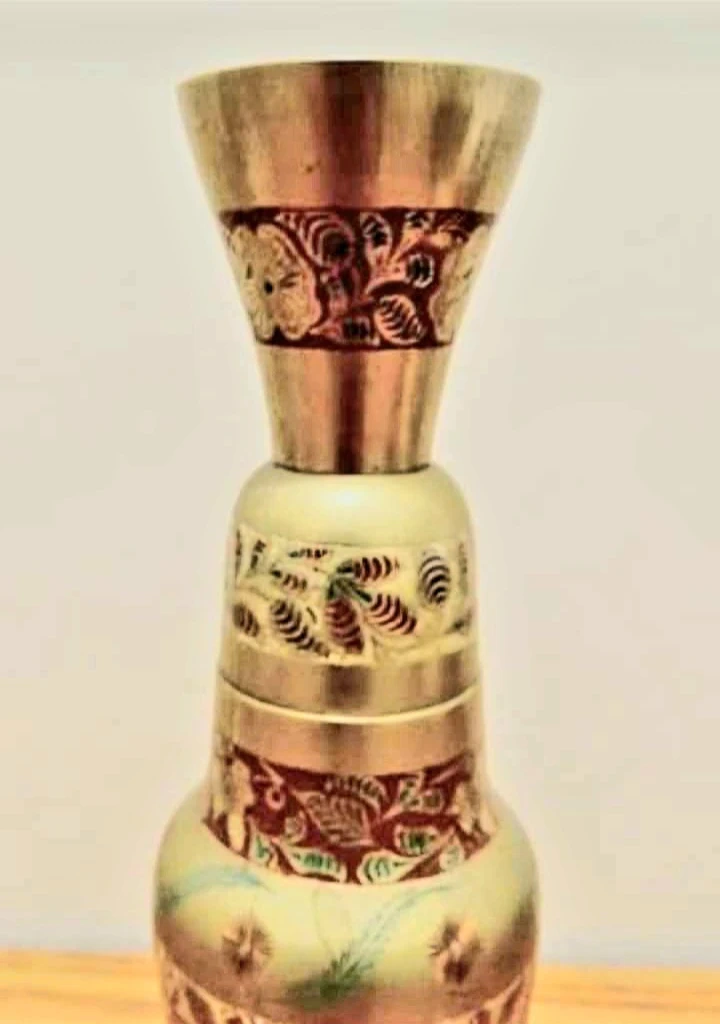Vtg Boho Hand Painted Etched Brass Vase