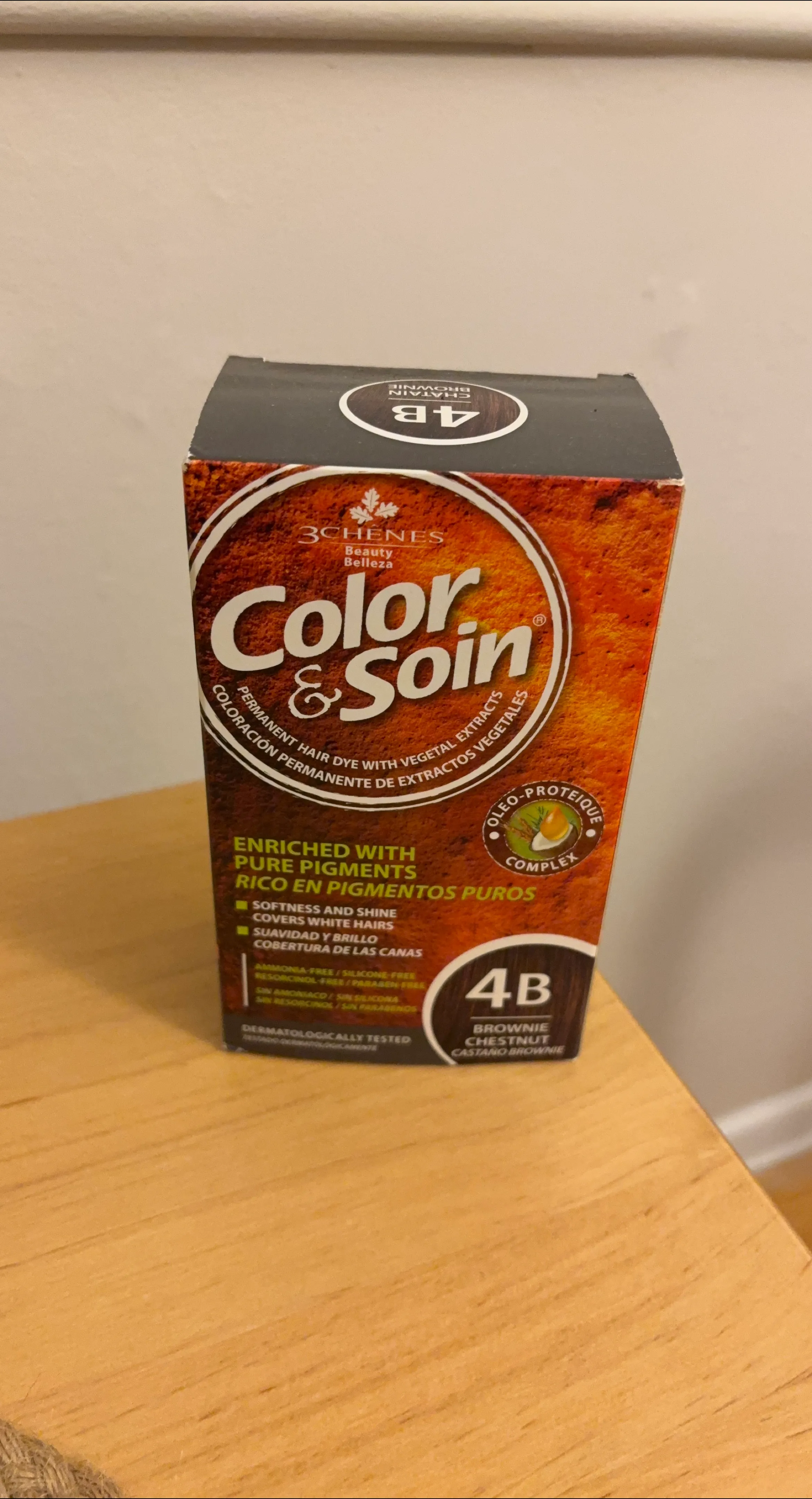 Selling a Color & Soin permanent hair dye in 4B Brownie Chestnut. It's enriched with pure pigments for softness and shine, and covers white hairs. It's also dermatologically tested