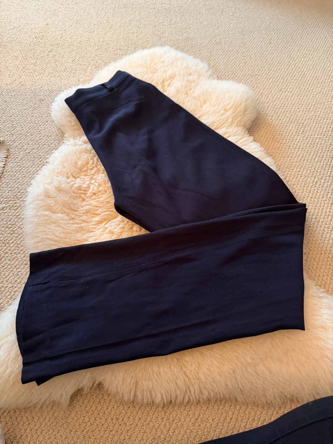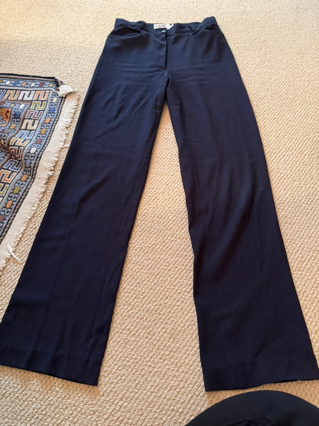 Adres black dress pants. Wide leg style with a button and zip closure. Two front pockets. Made from a polyester blend.