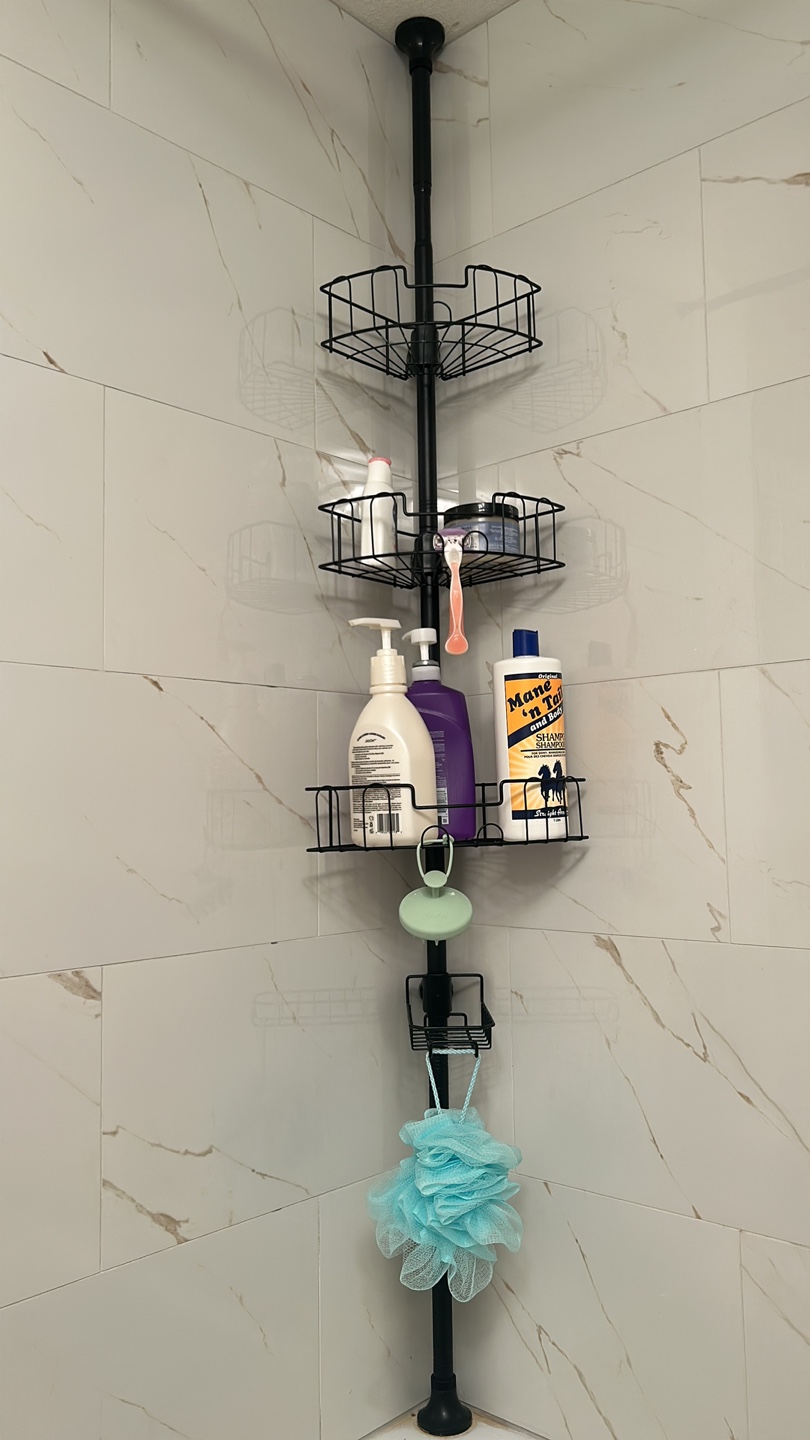 Selling a black telescopic shower caddy. It's in great shape and perfect for organizing your shower essentials. The caddy has multiple shelves to hold shampoo, soap, and other items. It's easy to install and fits neatly into the corner of your shower!