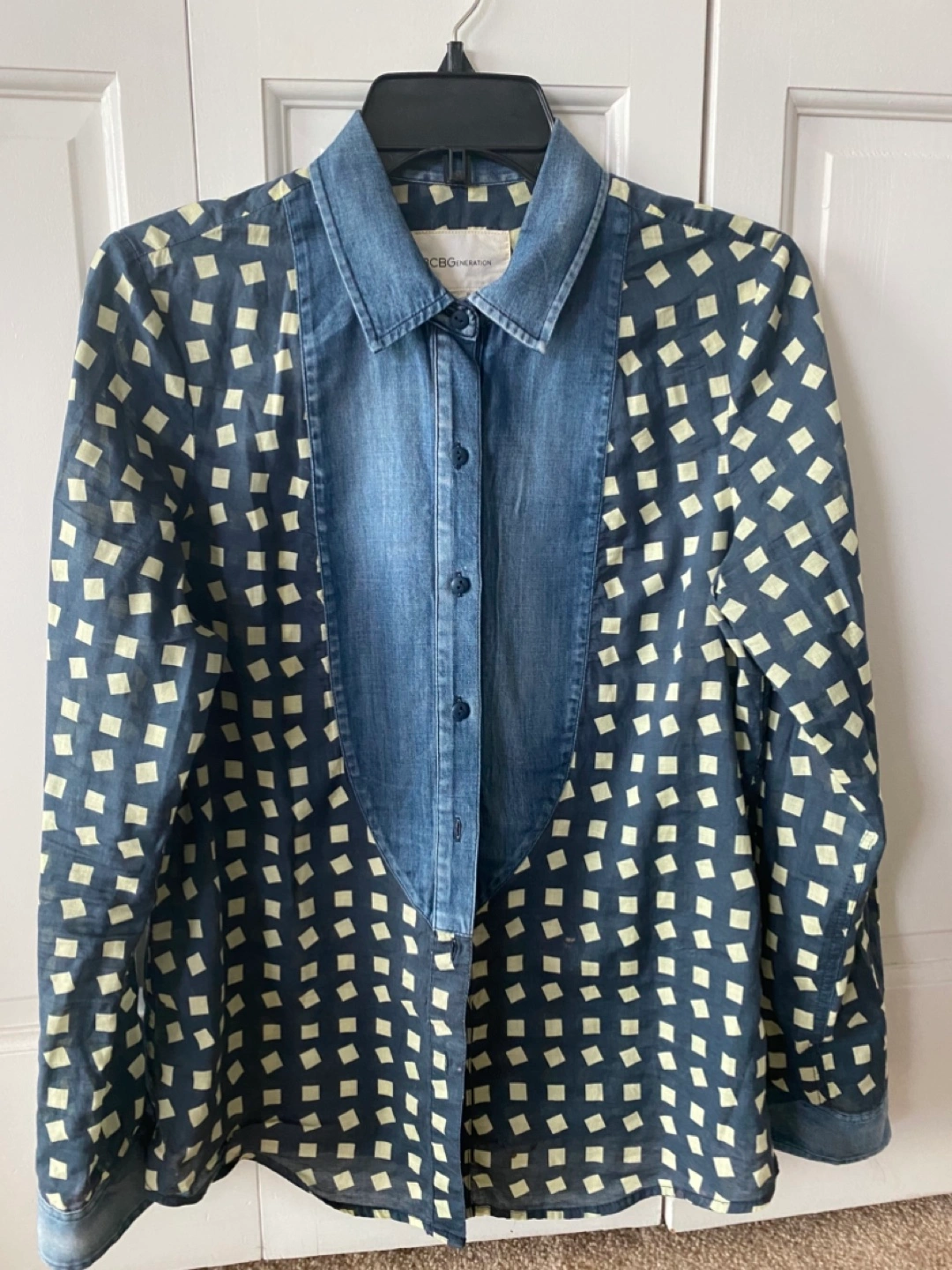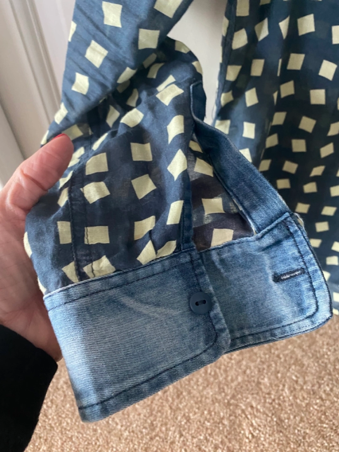 Long-sleeved button-up blouse with a denim yoke and a patterned bodice. Size S.